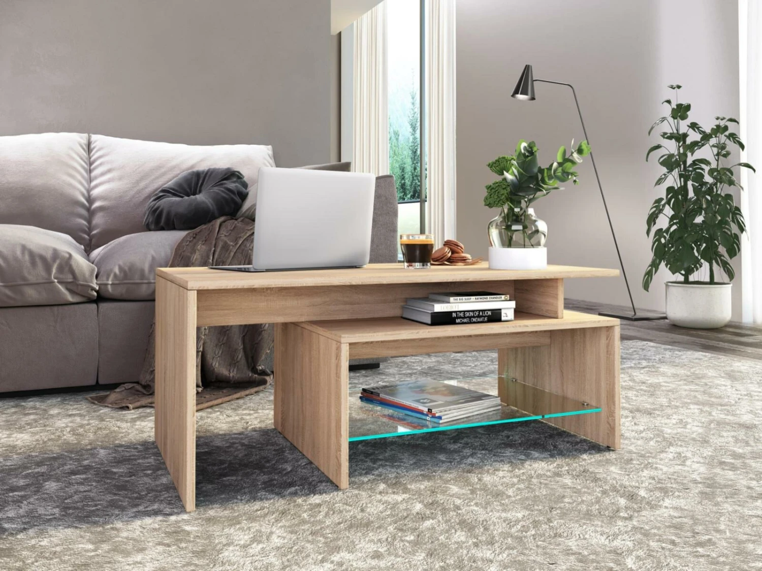 Couchtisch PILAS – Sonoma Eiche – Glasablage – 100 cm