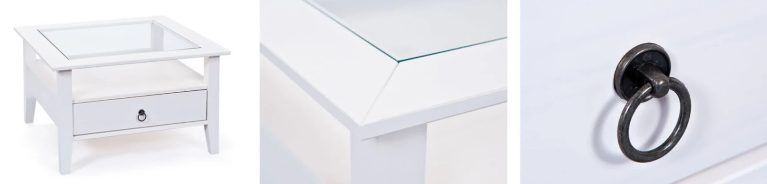 Couchtisch PROVENCE – weiß – mit Schublade und Glasplatte