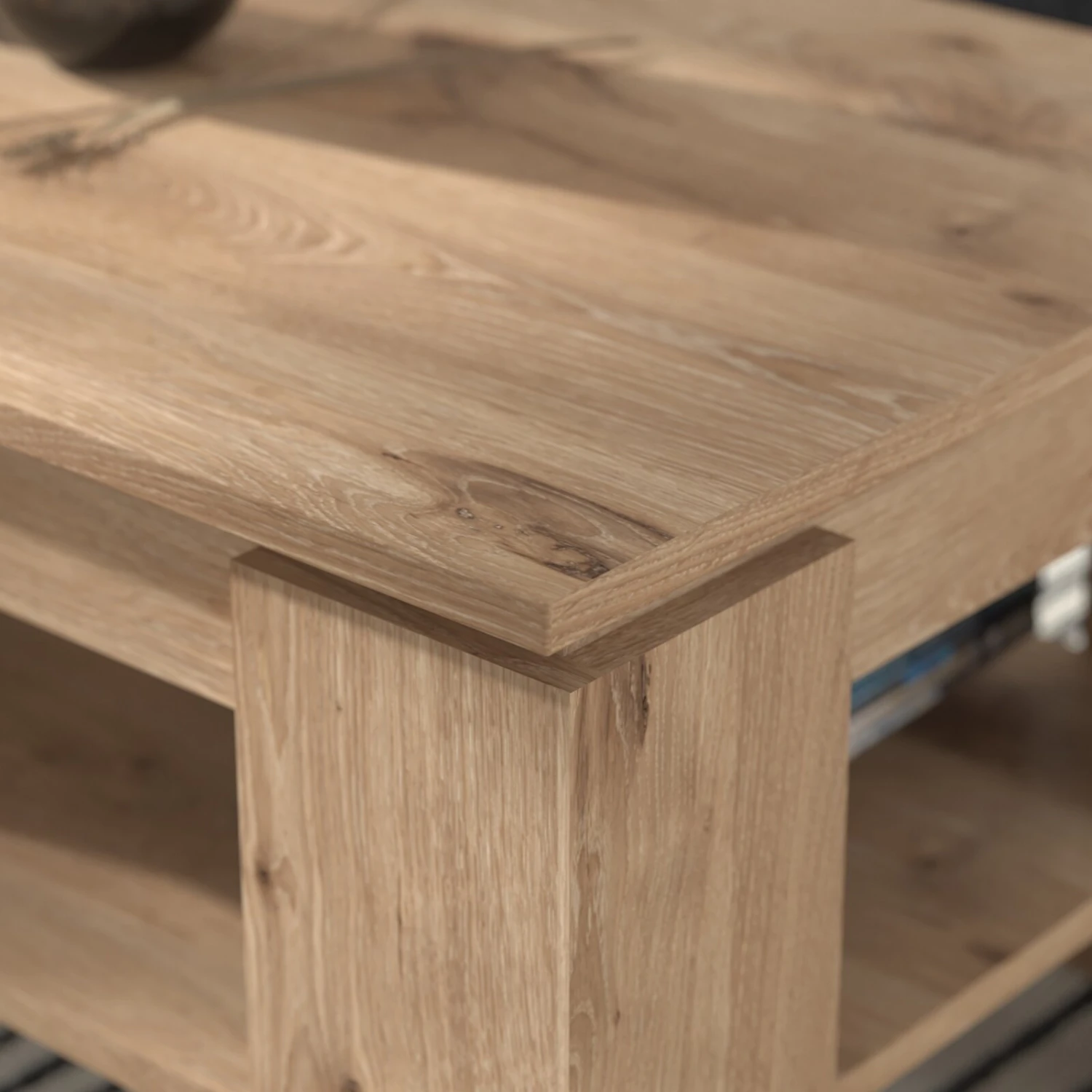 Moderner Couchtisch in Viking Oak Nachbildung. Er ist mit einer Ablage ausgestattet, damit Sie Ihre Fernbedienungen, Fernsehzeitungen und weitere Utensilien problemlos unterbringen können. Dieser Couchtisch ist mit seinen Winkelfüßen ein echter Hingucker.