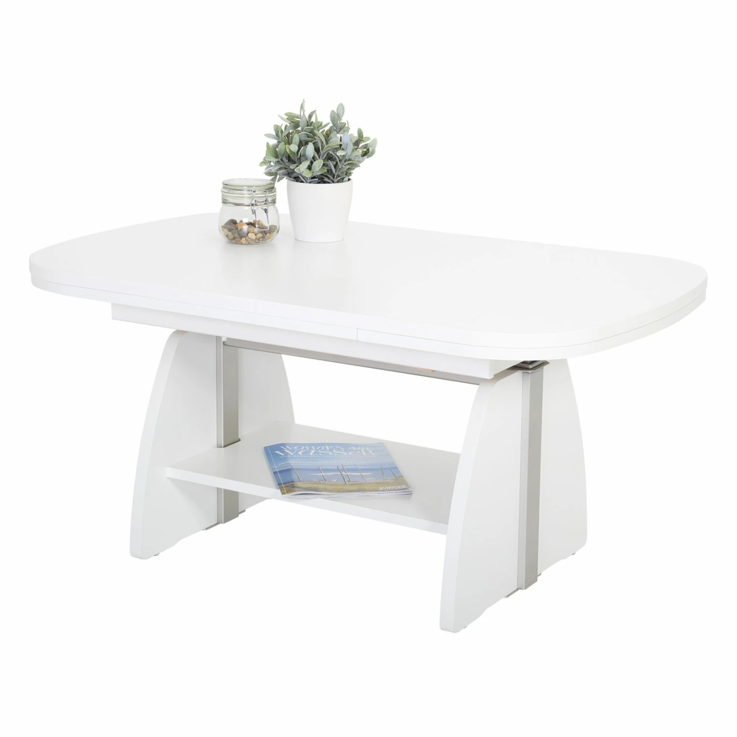 Dieser Couchtisch in der Farbe Weiß wird nicht nur dein Wohnzimmer verschönern, sondern überzeugt auch durch seine hohe Funktionalität. Er ist höhenverstellbar und beidseitig ausziehbar. Somit bietet er dir eine große Ablagefläche.