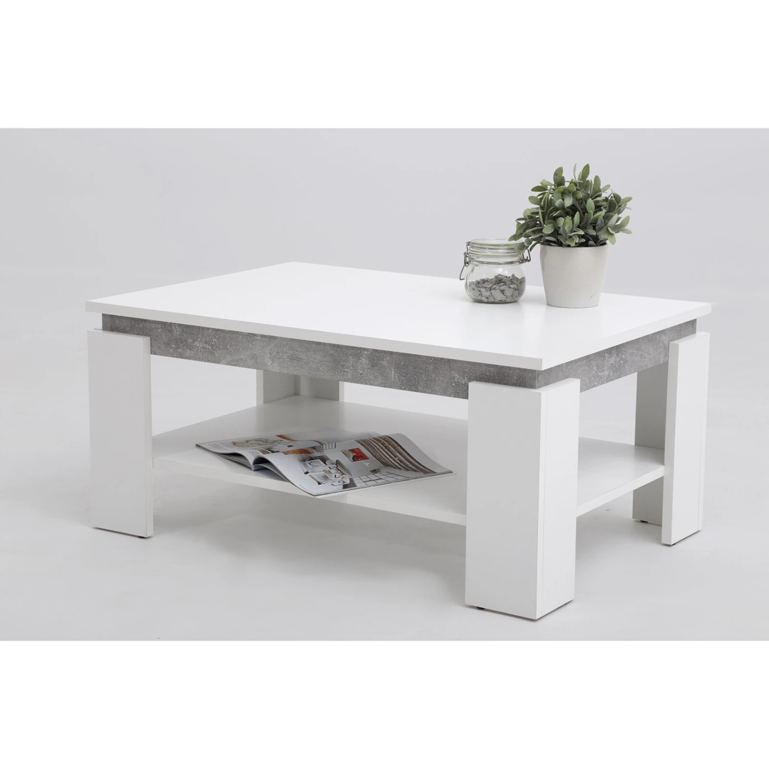 Schlichter und gleichzeitig moderner Couchtisch in Weiß. Der Tischrahmen ist mit einer Betonoptik abgesetzt und ist so ein echter Blickfang. Der Couchtisch verfügt über einen Ablageboden für Fernbedienungen, die Fernsehzeitung oder andere Utensilien.
