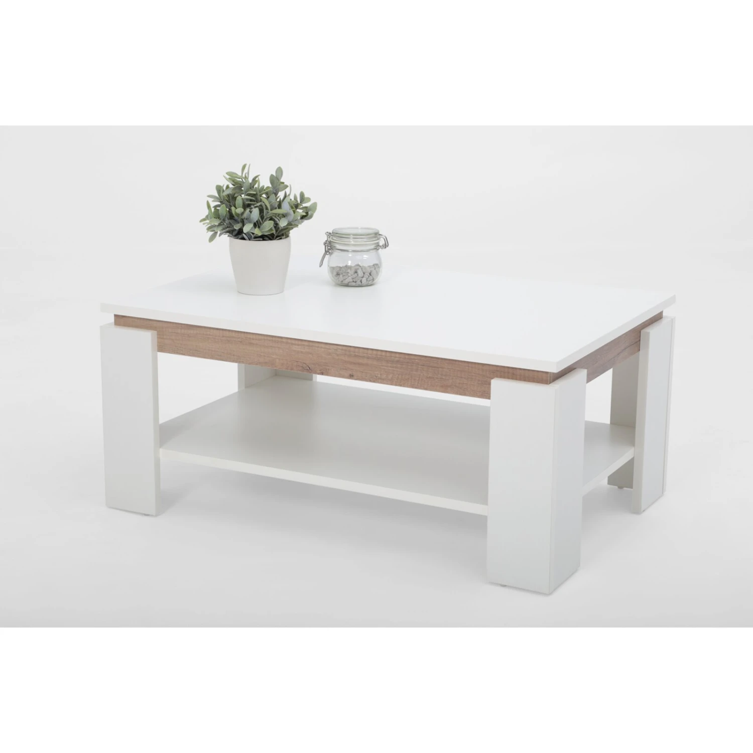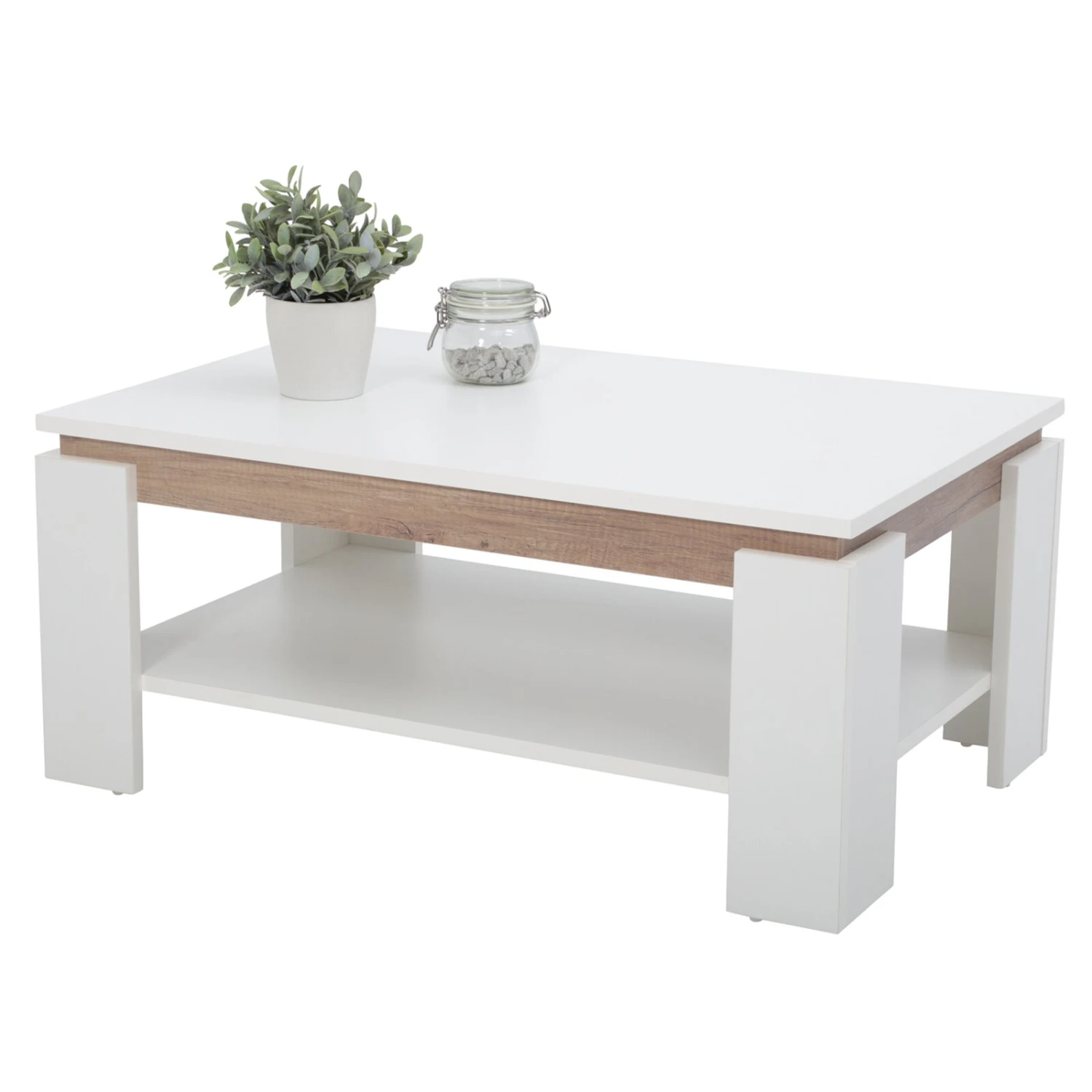 Schlichter und gleichzeitig moderner Couchtisch in Weiß. Der Tischrahmen ist in einer Wildeiche Nachbildung abgesetzt und ist so ein echter Blickfang. Der Couchtisch verfügt über einen Ablageboden für Fernbedienungen, die Fernsehzeitung oder andere Utensilien.