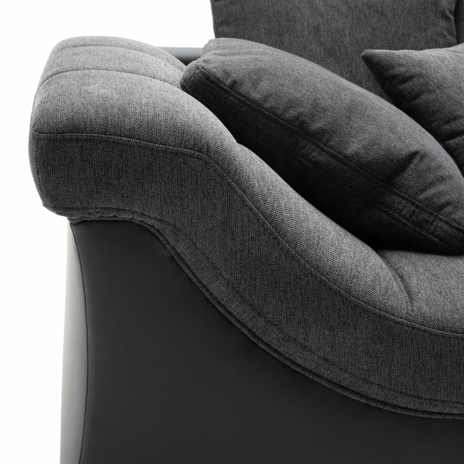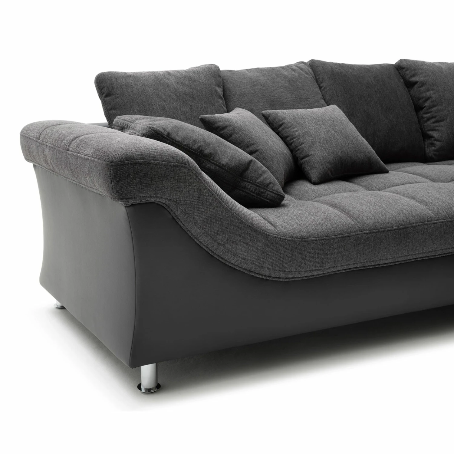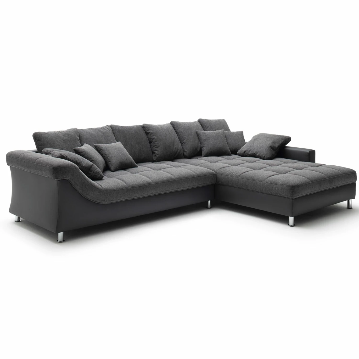 Dieses L-förmige Ecksofa besticht durch seine tolle Materialkombination aus Webstoff und Kunstleder. Das Sofa bietet eine hervorragende Entspannungsmöglichkeit, durch die beidseitig montierbare Recamiere und den 2-Sitzer mit einer großen Sitzfläche. Das moderne Design des Sofas wird durch die runden, chromfarbenen Füße abgerundet. Das Zusammenspiel aus der Polyätherschaum-Polsterung und der Wellenunterfederung erzeugt einen bequemen Sitz.