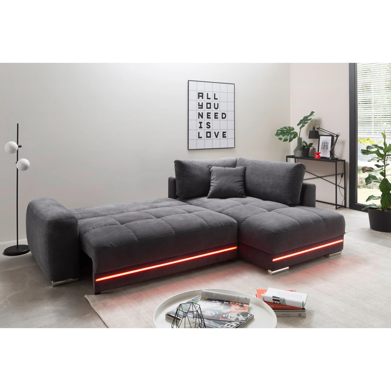 Einladendes Ecksofa mit EasyBett-Funktion, das sich dank der Liftbeschläge im Handumdrehen zum bequemen Gästebett umfunktionieren lässt. Der geräumige Bettkasten bietet ausreichend Platz für Bettzeug. Die Garnitur kann frei im Raum gestellt werden, da sie rundum bezogen ist. Ganz nach persönlichem Bedarf und räumlichen Voraussetzungen ist die einladende Ottomane einmalig rechts- oder linksseitig montierbar. Für die besondere Gemütlichkeit sind auch die vier Rückenkissen und zwei Zierkissen im Lieferumfang enthalten. Durch die FANCY-LED-Lichtstreifen entsteht ein zauberhaftes Ambiente. Per Fernbedienung können ganz bequem die unterschiedlichsten Farben angewählt werden.