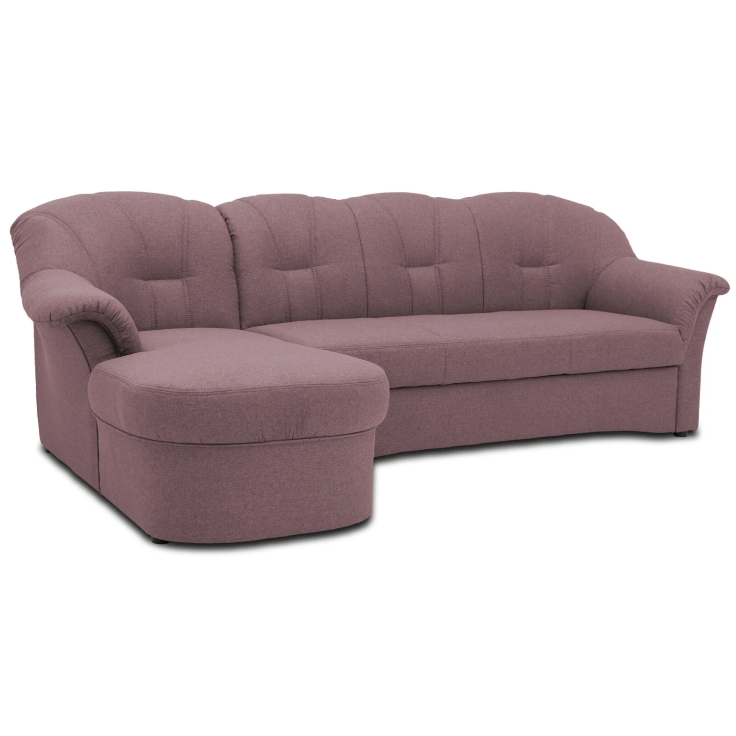 Modernes Ecksofa mit Ottomane in beerefarbenem Feingewebebezug. Der Bezug ist weich und formbeständig. Da der Rücken ebenfalls mit dem Originalstoff bezogen ist, kann das Sofa auch in der Mitte des Raumes platziert werden. Mach dieses Ecksofa zu deinem neuen Wohlfühlort im Wohnzimmer!