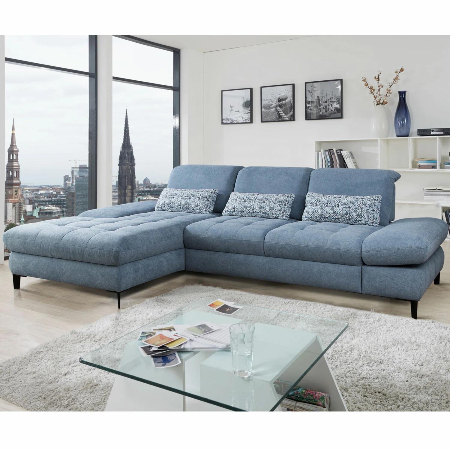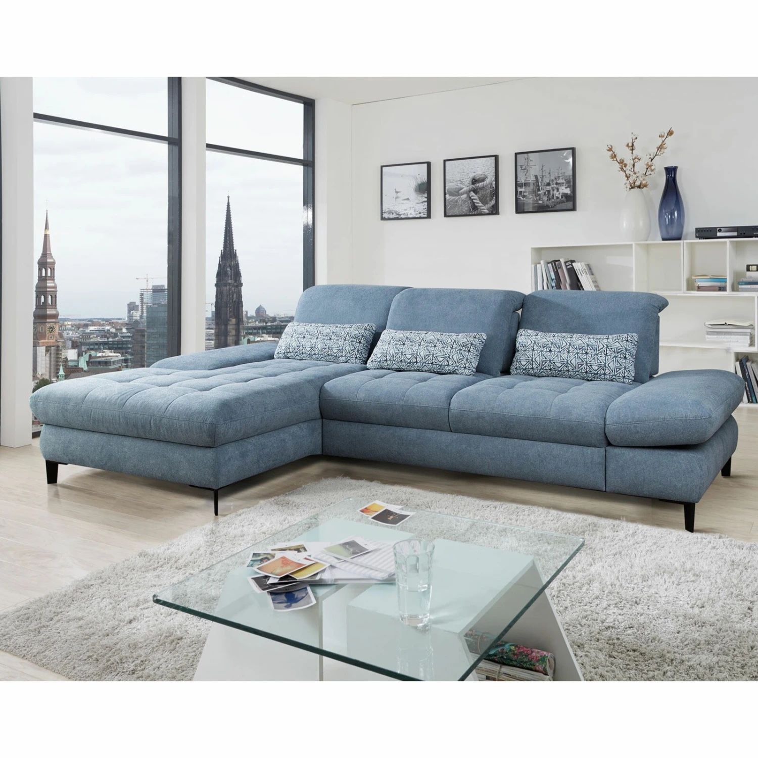 Dieses moderne Sofa in Blau lässt den Alltagsstress vergessen! Die Polyurethanschaum-Polsterung sorgt in Kombination mit den Wellenfedern und Gummigurten für einen tollen Sitzkomfort.Durch den Schwenkrücken an drei Stellen können SIe Ihren Sitzplatz individuell anpassen. Der Rücken ist mit dem Originalstoff bezogen, so dass Sie das Sofa auch in der Mitte des Raumes platzieren können.Die matt-schwarzen Metallfüße bilden einen schönen Kontrast zum Bezugsstoff. Machen Sie es sich auf diesem stilvollen Ecksofa einfach bequem!