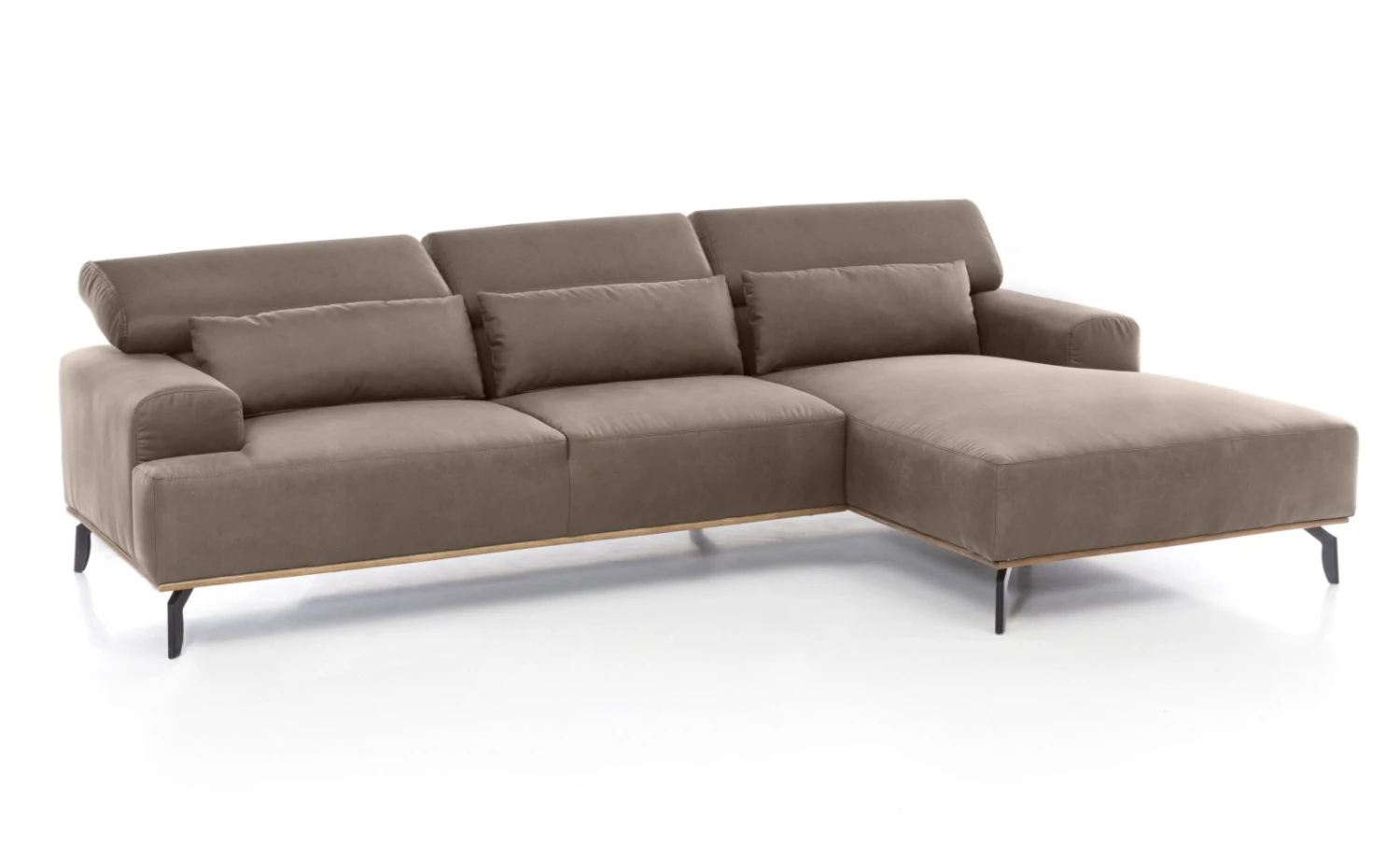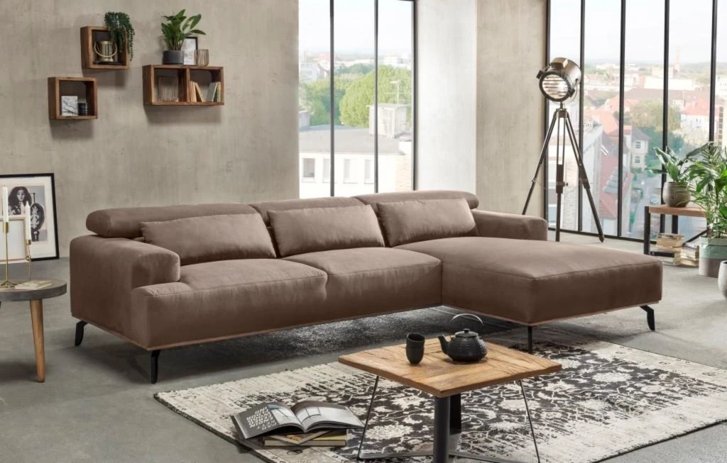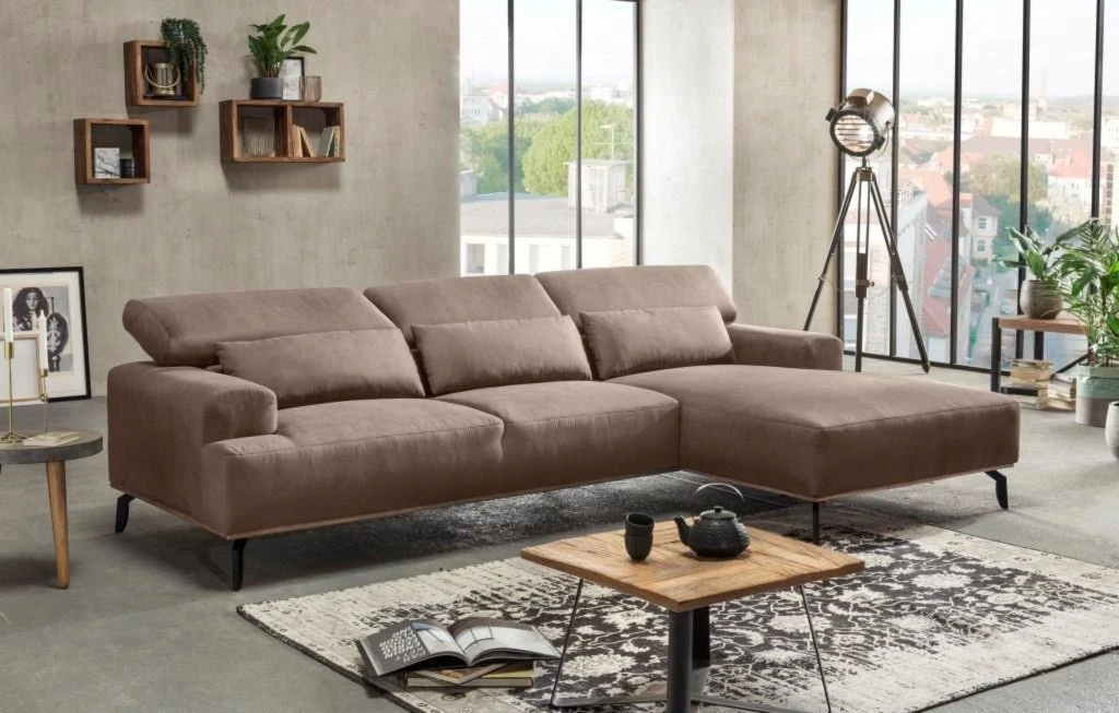 Das braune Ecksofa ist mit einem robusten Microfaserbezug ausgestattet, welcher zum komfortablen Sitz beiträgt. Für noch mehr Komfort sorgt die Wellenunterfederung, sowie die verstellbaren Kopfstützen. Diese lassen sich von etwa 74 auf 90 Zentimeter in der Höhe verstellen. Zudem befinden sich im Lieferumfang drei Nierenkissen, die mit dem gleichen Stoff wie das Ecksofa bezogen sind. Diese runden die Optik der Couch noch stimmig ab und machen den Sitzkomfort noch angenehmer.