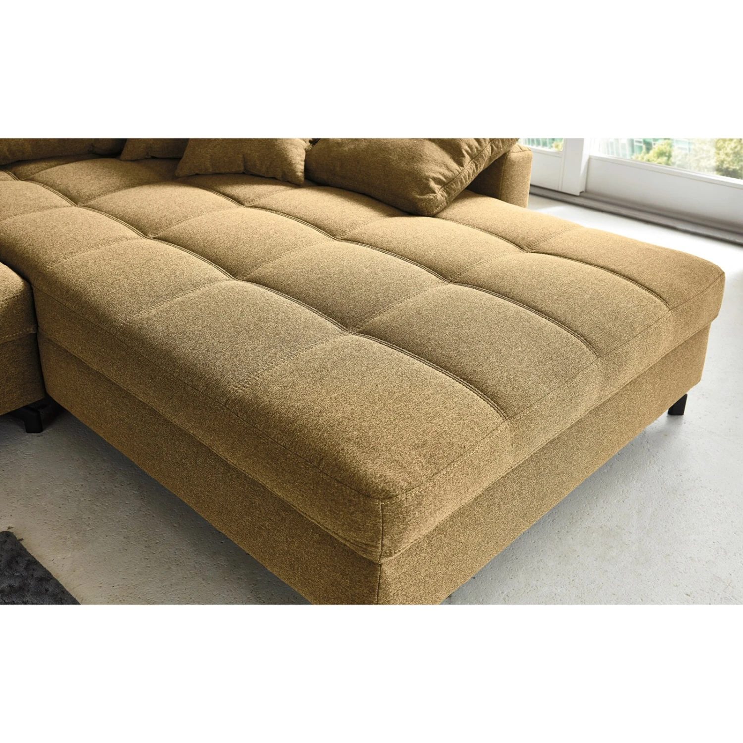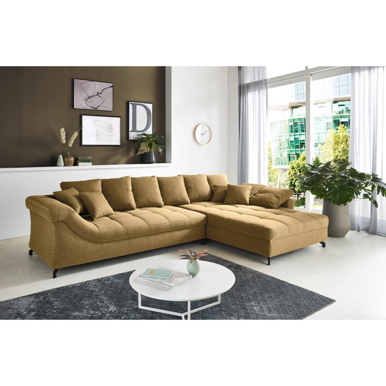 Lassen Sie mit dieser wunderschönen Wohnlandschaft in der Farbe curry Ihr Wohnzimmer in einem neuen Glanz erstrahlen. Dank der flexibel montierbaren Recamiere passt dieses Sofa wunderbar in jeden Wohnraum. Das moderne Design wird mit wunderbarem Komfort unterstützt und wird somit zur ersten Wahl. Die Polsterung sorgt dazu noch für ein einzigartiges Sitzgefühl und überzeugt durch seine Langlebigkeit. Der Bezug ist zudem sehr pflegeleicht, wodurch dieses Sofa zum frustfreien Gebrauch einlädt. Holen Sie sich dieses Sofa in Ihre vier Wände und ergänzen Sie Ihren Wohnraum mit diesem gemütlichen und schönen Sofa.