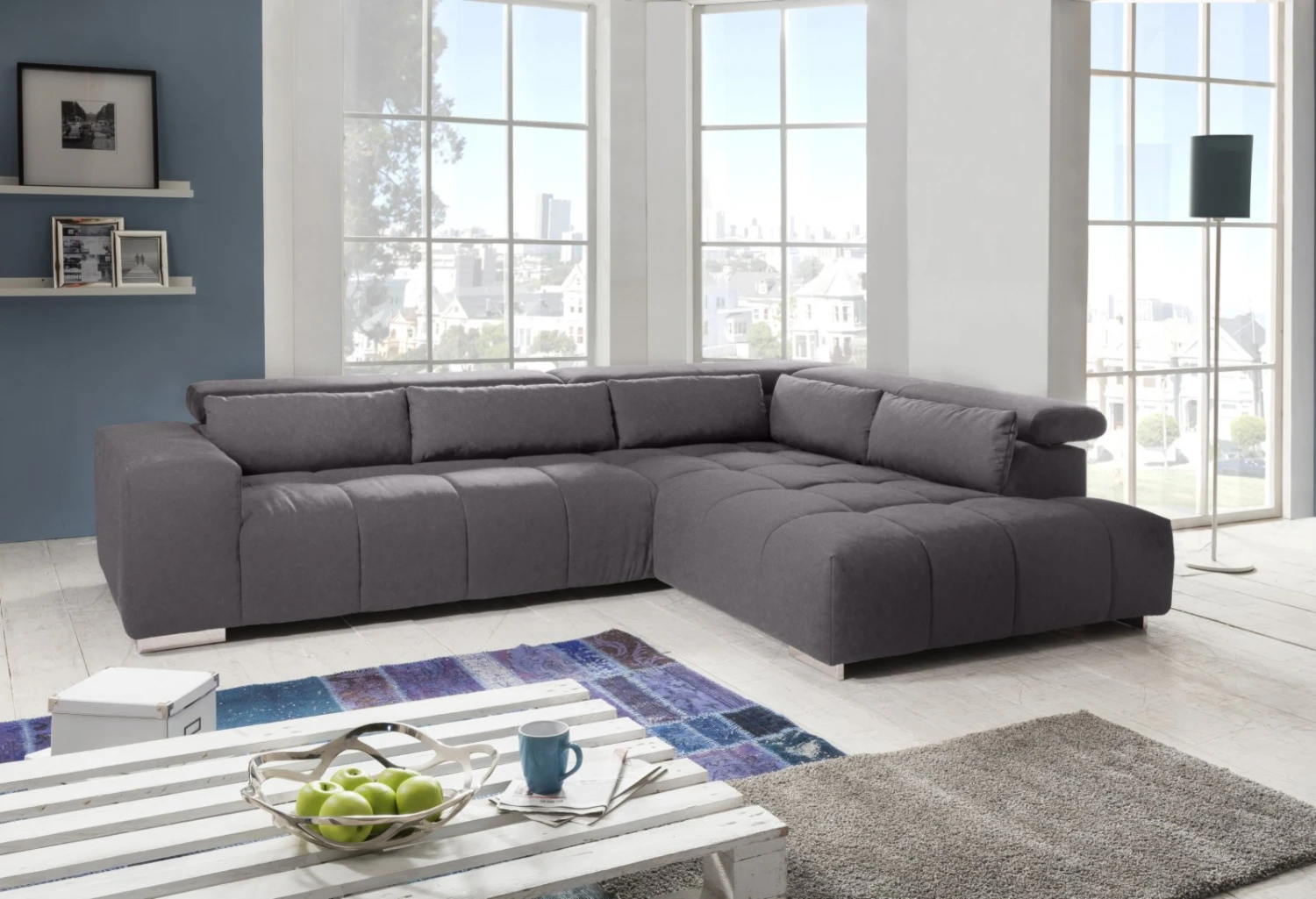 Mit diesem dunkelgrauen Ecksofa bringen Sie frischen Wind in Ihr Wohnzimmer. Die extra breite Ottomane und die fünf Nierenkissen laden dabei einfach zum Relaxen ein. Da der Rücken dieses Ecksofas mit dem Originalstoff bezogen ist, kann es überall frei in den Raum gestellt werden.
