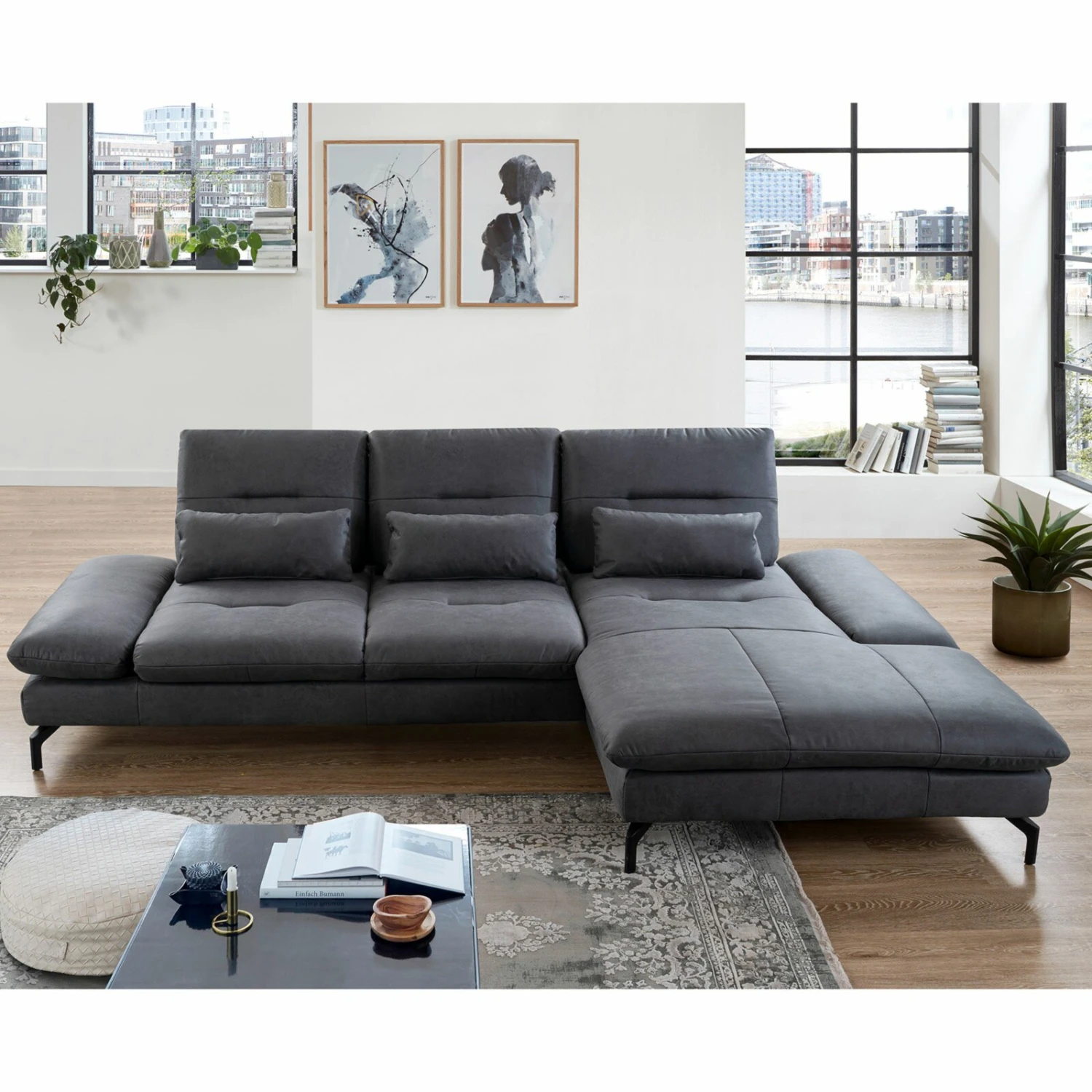 Mit diesem Ecksofa nutzen Sie Ihre vier Wände hervorragend aus. Sitzen und Liegen Sie gemütlich auf PUR-Schaum mit Wellenunterfederung. Alle drei Rücken dieses Sofas unterstützen Sie bei Ihrer Entspannung, denn es handelt sich um Schwenkrücken, die unabhängig voneinander verstellt werden können. Zudem ist der Rücken der Garnitur echt bezogen, sodass sie mittig im Raum platziert werden kann. Abgerundet wird das Sofa von schwarz matten Metallfüßen, die die moderne Erscheinung unterstreichen.