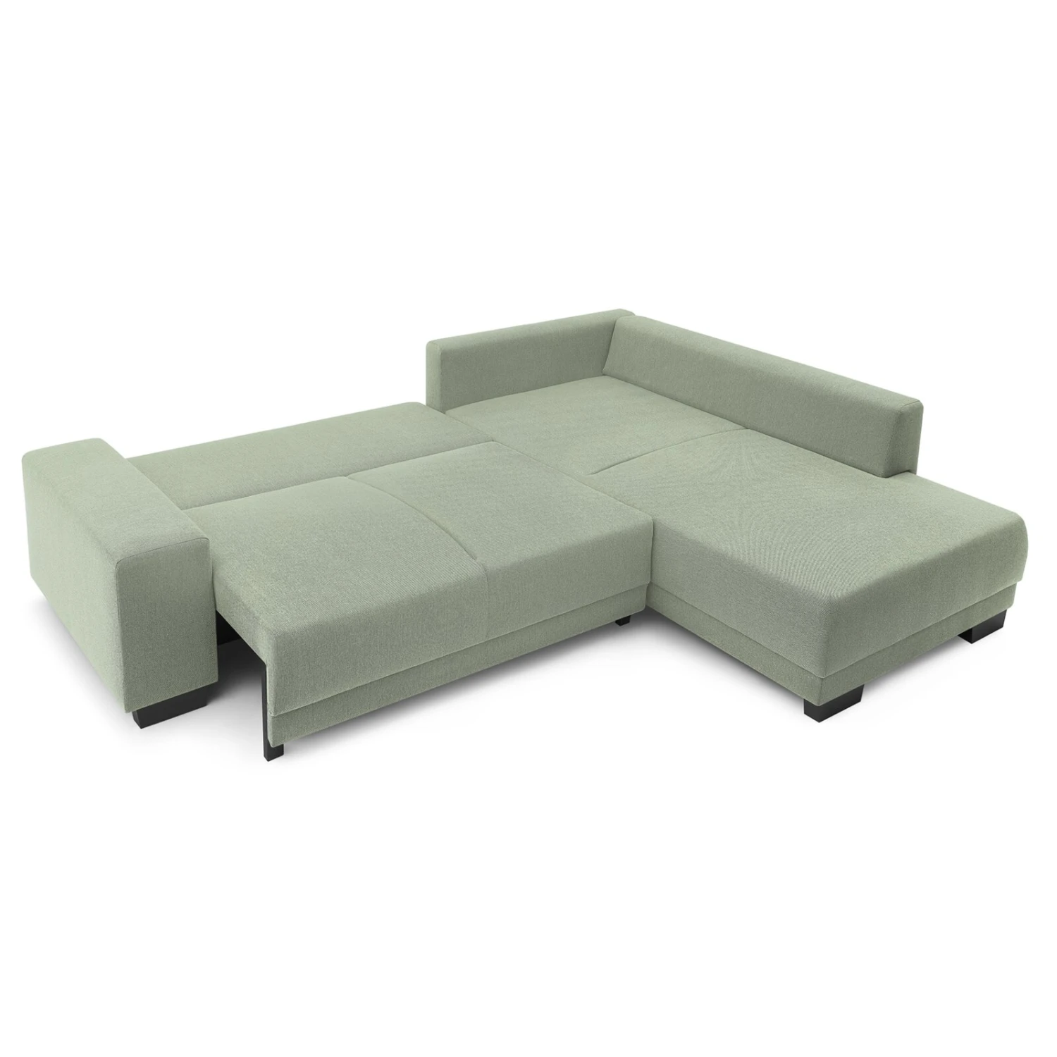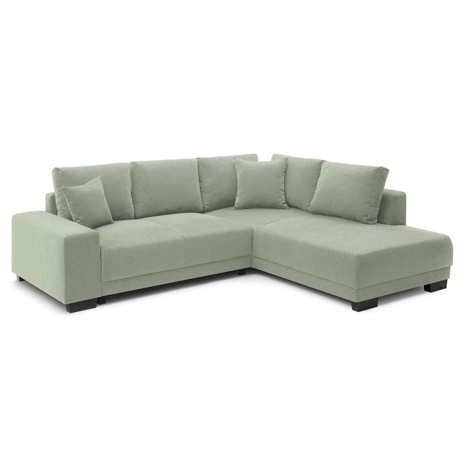 Mit diesem schicken Ecksofa holen Sie sich eine echte Wohlfühloase in Ihr Zuhause. Ausgestattet mit einer Liegefläche können Sie es sich richtig gemütlich machen oder Ihren Gästen eine vorrübergehende Übernachtungsmöglichkeit anbieten. In einem Staukasten lassen sich mühelos Kissen und Decken unterbringen. Die Schaumstoffpolsterung auf Nosagfederung schafft ein angenehmes und stabiles Sitzgefühl. Der frische grüne Webstoffbezug passt bestens in nahezu jeden Wohnstil.