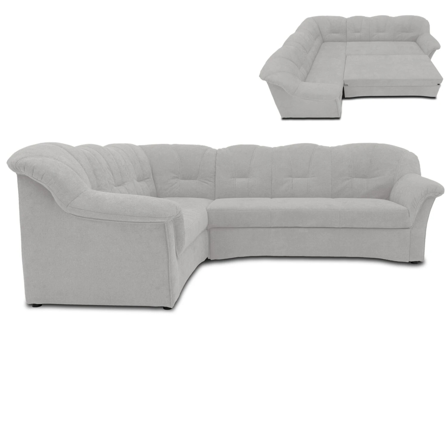 Modernes Ecksofa in Hellgrau. Mit der Liegefunktion hast du die Möglichkeit deinen Gästen einen vorübergehenden Schlafplatz anzubieten oder sie wird zur zusätzlichen Entspannung ausgezogen. Der Microfaserbezug ist weich und formbeständig. Da der Rücken ebenfalls mit dem Originalstoff bezogen ist, kann das Sofa auch in der Mitte des Raumes platziert werden. Mach dieses Ecksofa zu deinem neuen Wohlfühlort im Wohnzimmer!