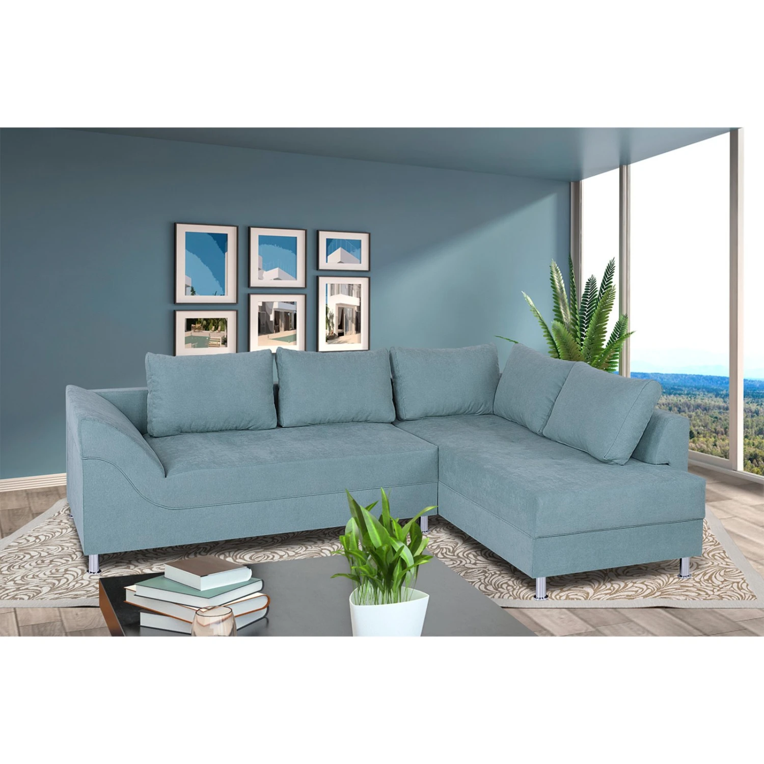 In einem faszinierden Mintton präsentiert sich dieses Ecksofa! Der Farbton wird ein echter Hingucker in Ihrem Wohnzimmer sein. Ihren Freunden und Ihrer Familie können Sie einen hervorragenden Komfort bieten, denn diese Wohlfühloase verfügt im Sitz über einen Bonellfederkern. Die 5 Kissen, die im Lieferumfang mit inbegriffen sind, machen nicht nur optisch was her, zudem tragen sie auch zur Gemütlichkeit bei. Bei diesem Ecksofa haben Sie die Möglichkeit, es frei in den Raum zu stellen, da der Rücken mit dem Originalstoff bezogen ist.