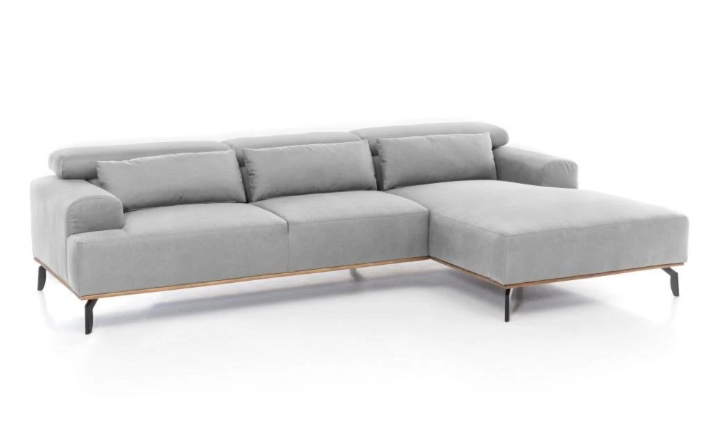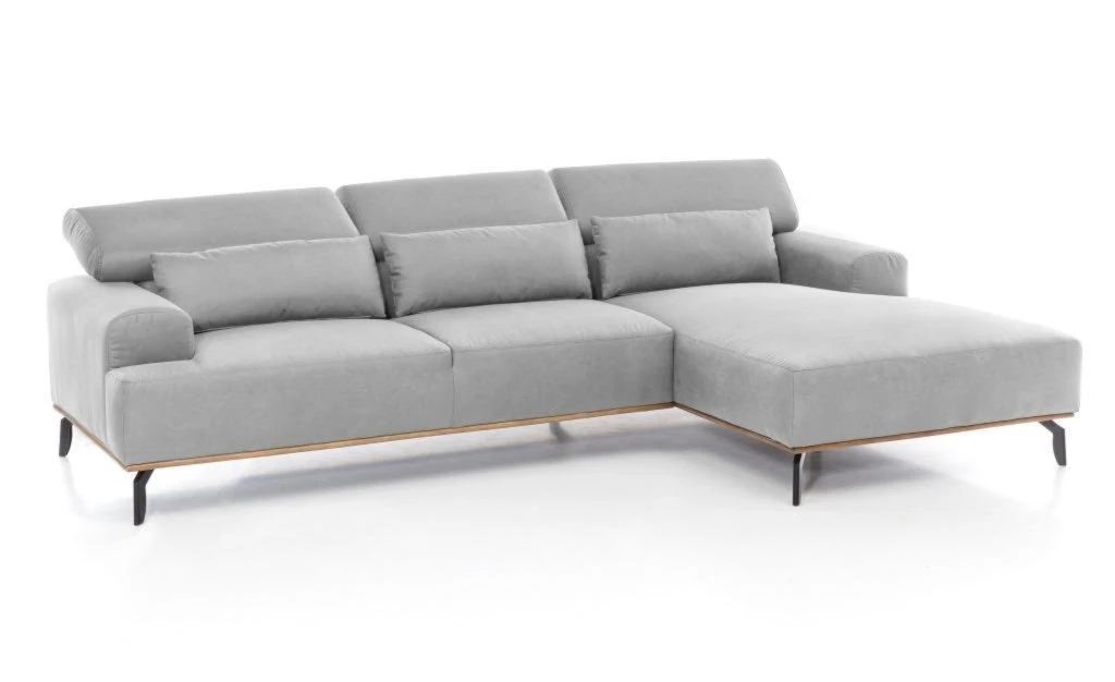 Das silberne Ecksofa ist mit einem robusten Microfaserbezug ausgestattet, welcher zum komfortablen Sitz beiträgt. Für noch mehr Komfort sorgt die Wellenunterfederung, sowie die verstellbaren Kopfstützen. Diese lassen sich von etwa 74 auf 90 Zentimeter in der Höhe verstellen. Zudem befinden sich im Lieferumfang drei Nierenkissen, die mit dem gleichen Stoff wie das Ecksofa bezogen sind. Diese runden die Optik der Couch noch stimmig ab und machen den Sitzkomfort noch angenehmer.