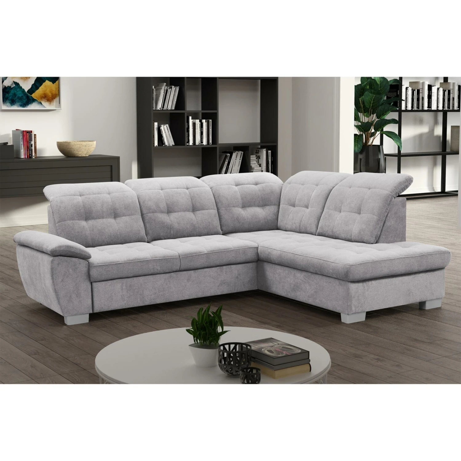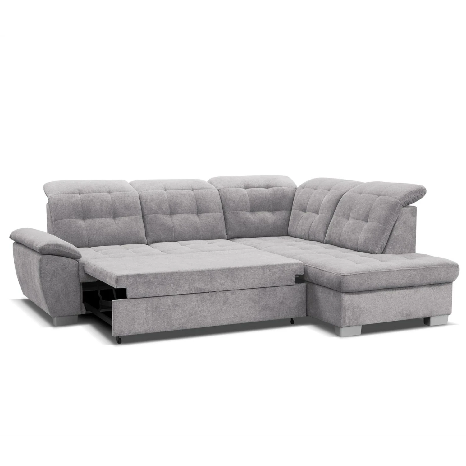 Das silberne Ecksofa lädt mit seiner Breite von etwa 255 Zentimetern zum Relaxen und Entspannen ein. Für den bequemen und stabilen Sitz sorgen die Nosagunterfederung und die Schaumstoffpolsterung, die im Zusammenspiel einen hohen Komfort bieten. Zudem verfügt das Sofa über eine Kopfteilverstellung an fünf Stellen, über eine Liegefunktion und einen integrierten Staukasten, der viel Platz für Decken, Kissen und ähnliches bietet.