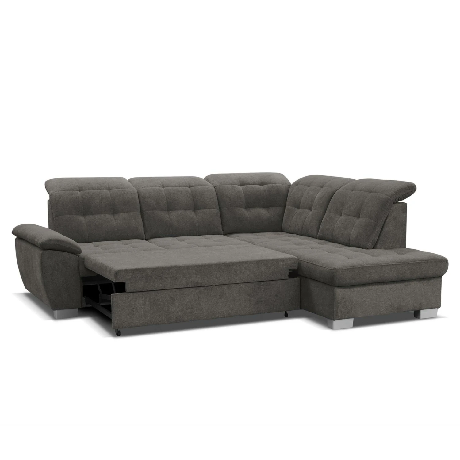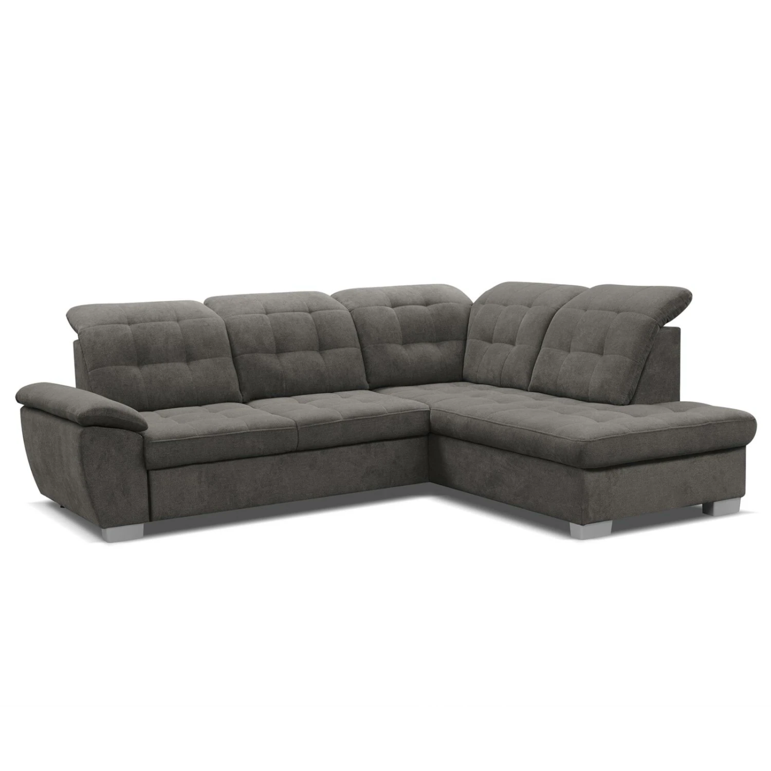 Das steinfarbene Ecksofa lädt mit seiner Breite von etwa 255 Zentimetern zum Relaxen und Entspannen ein. Für den bequemen und stabilen Sitz sorgen die Nosagunterfederung und die Schaumstoffpolsterung, die im Zusammenspiel einen hohen Komfort bieten. Zudem verfügt das Sofa über eine Kopfteilverstellung an fünf Stellen, über eine Liegefunktion und einen integrierten Staukasten, der viel Platz für Decken, Kissen und ähnliches bietet.