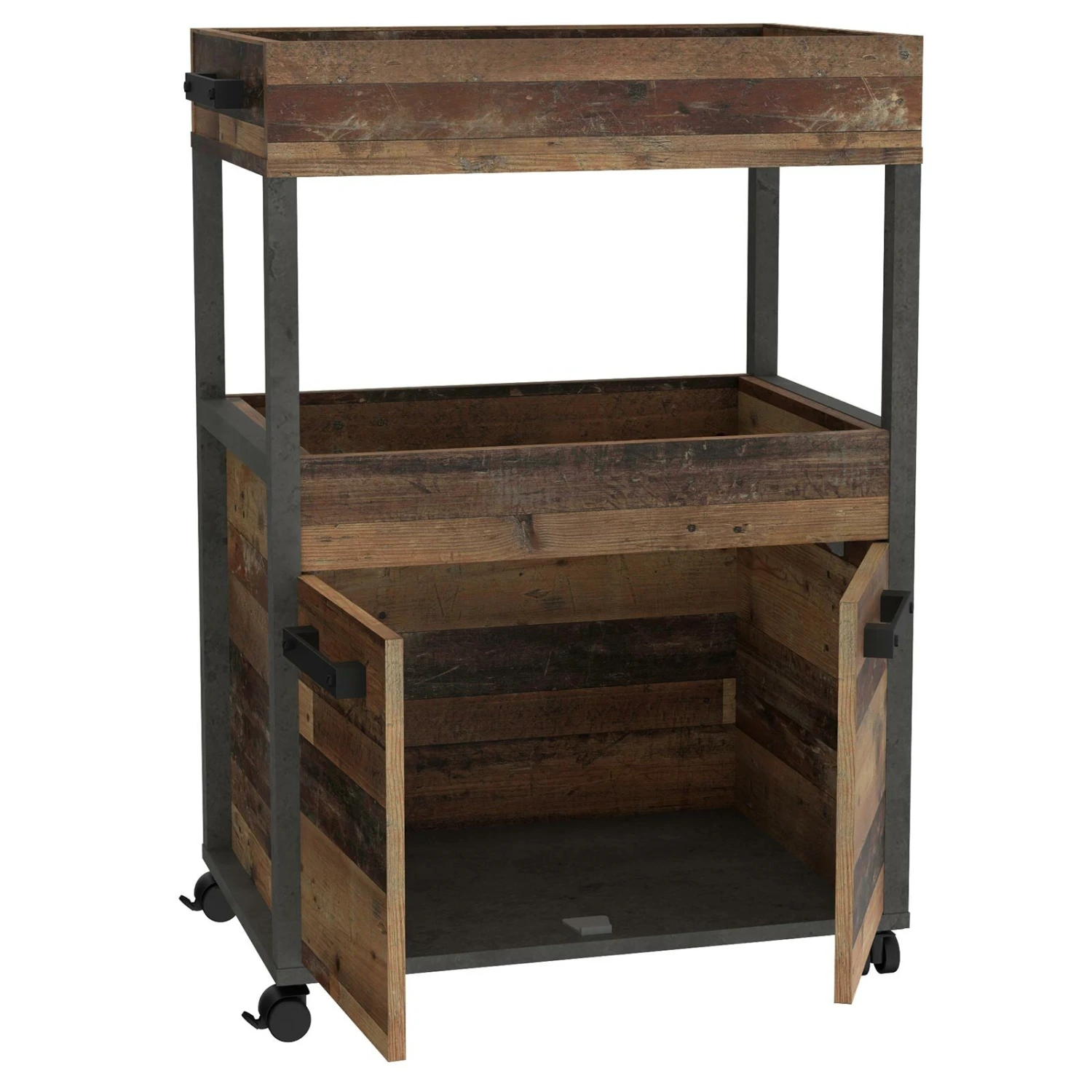 Die Hausbar spiegelt dank der Old Wood Vintage Nachbildung und der Betonoptik den angesagten Industrial Style wider und stellt Ihnen reichlich Platz zur Verfügung, um Ihre Getränke und Gläser stets griffbereit zu haben. Die kompakte Bar lässt sich bestens neben Ihrem Sofa oder in Ecken platzieren und ist mit den schwarzen Rollen im Handumdrehen an einem anderen Platz verschoben.