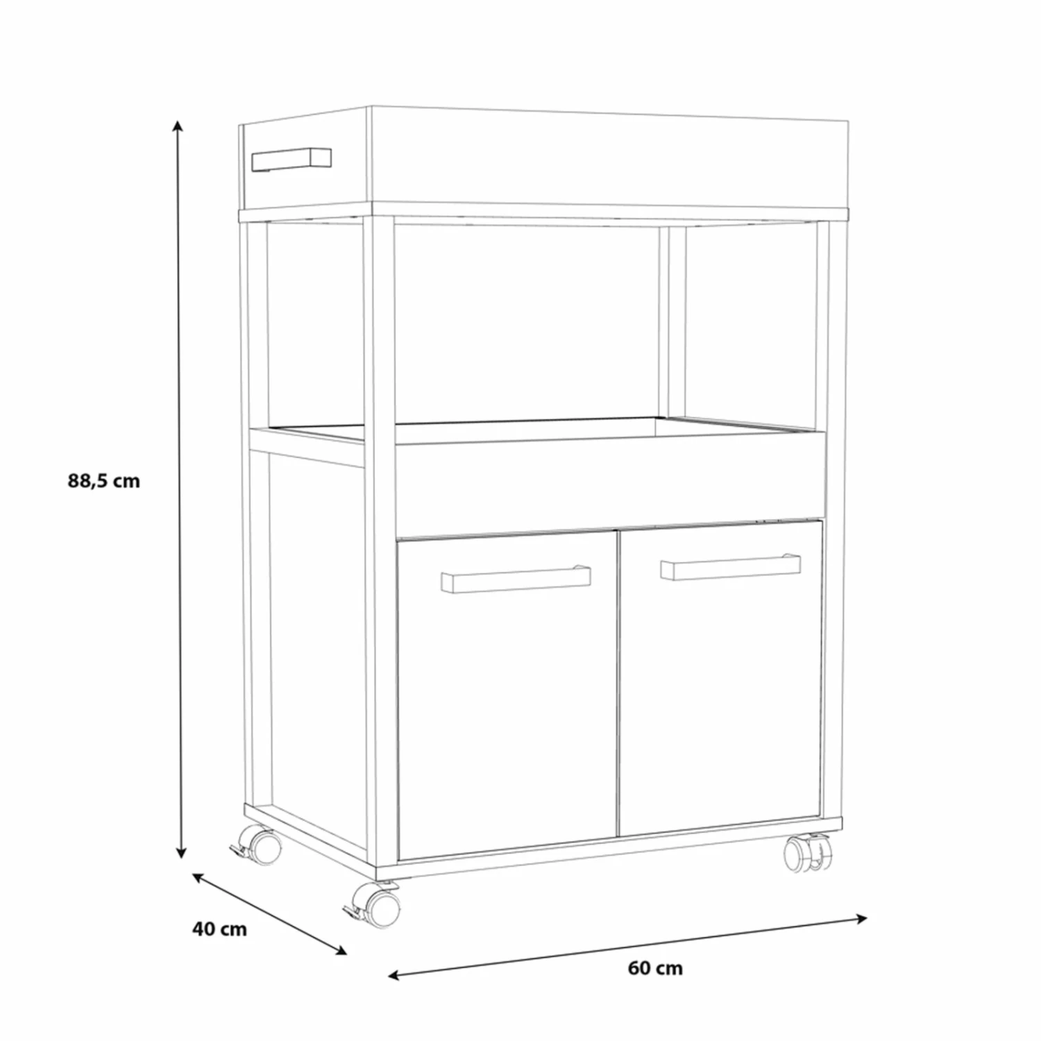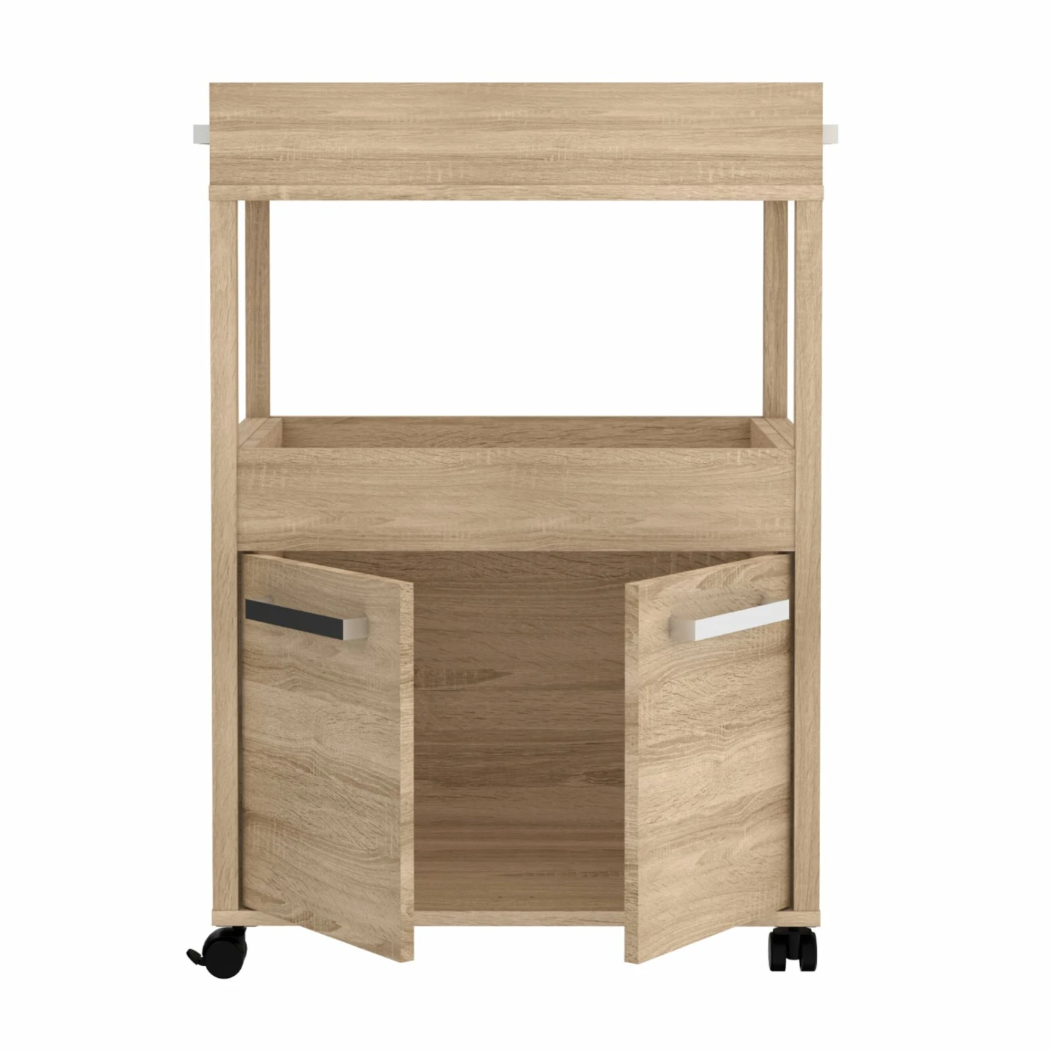 Diese praktische Hausbar bietet Ihnen reichlich Stauraum für Gläser, Getränke und weitere Utensilien, die Sie für das Mixen und die Präsentation nutzen. Durch die beiden Drehtüren ist alles gut verstaut, aber auch sehr schnell zur Hand. Präsentieren Sie Ihre Schätze, wie besondere Whskeysorten, alten Wein oder ausgefallene Zutaten im offenen Bereich. Dieser befindet sich direkt unter der Ablage diese sie zum Mischen nutzen können. Dank der vier Rollen und der Griffe an beiden Seiten ist die Bar überall einsatzbereit, gehen Sie von Tisch zu Tisch oder gehen Sie von Raum zu Raum.