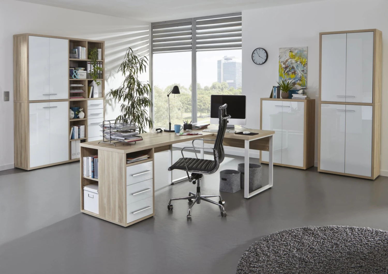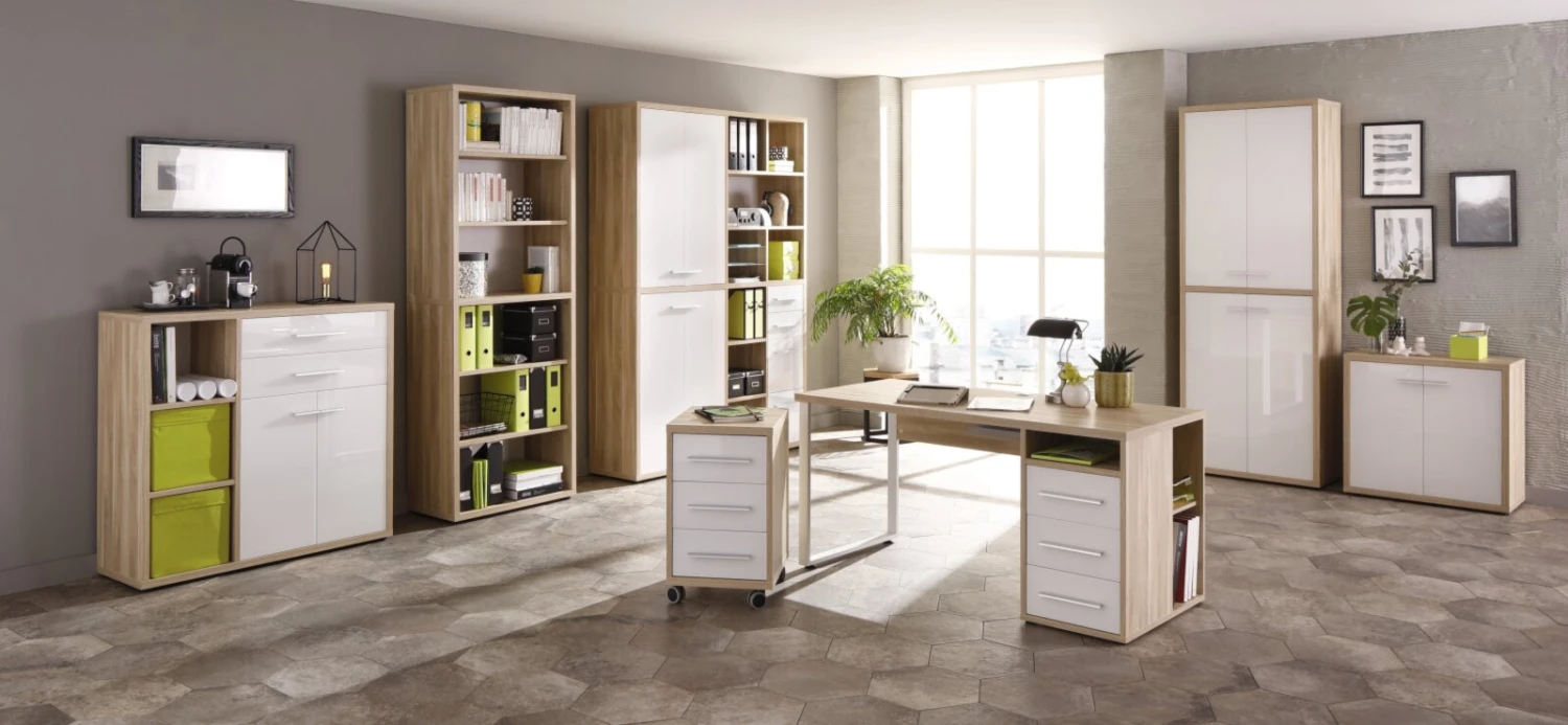 Diese moderne Highboard-Regal-Kombination ist in schlichter Eiche Nachbildung und Weiß gehalten. Die vielen unterschiedlichen Fächer mit Einlegeböden bieten viel Stauraum für Ihr „Hab und Gut“. Die vier Schubkästen und Türen lockern das Gesamtbild ebenfalls weiter auf und sorgen für jede Menge zusätzlichen Platz.