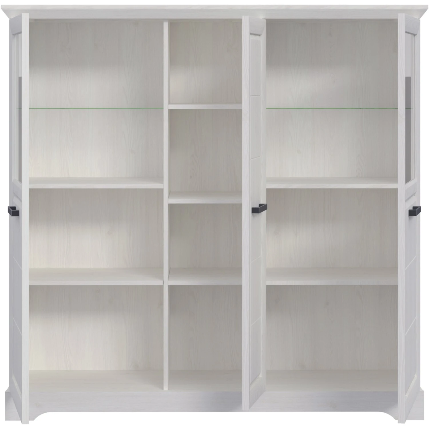 Bietet Ihnen viel Stauraum: das Highboard im traditionell interpretierten Landhausstil. Es ist ganz in Weiß gehalten und punktet mit der Sibiu-Lärche-Nachbildung. Die feine Maserung hebt sich dezent vom Hintergrund ab. Ein ansprechender Kontrast wird durch die Griffe in Schwarz gesetzt. Die beiden äußeren Türen sind mit Glaseinsätzen ausgestattet, hinter denen Sie auf den zwei Glasböden Bücher und Deko-Accessoires unterbringen können. Weitere Aufbewahrungsmöglichkeiten stehen Ihnen in den blickdichten Bereichen des Schranks zur Verfügung. Bei der Fertigung kommt Holzwerkstoff mit folierten Oberflächen zum Einsatz. Das Highboard mit insgesamt 12 Fächern besitzt die Maße BxHxT ca. 149,9 x 146,7 x 44,5 cm.
