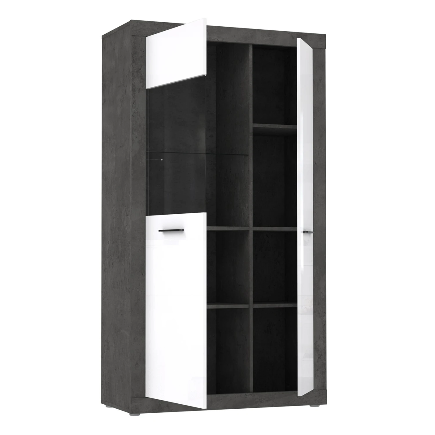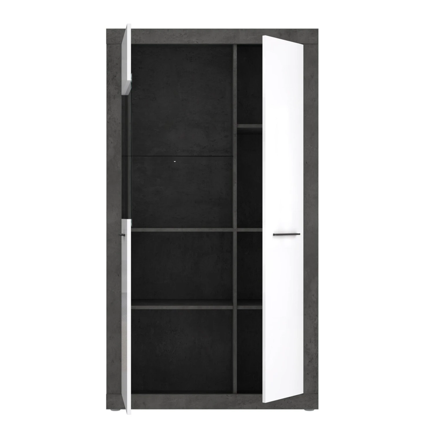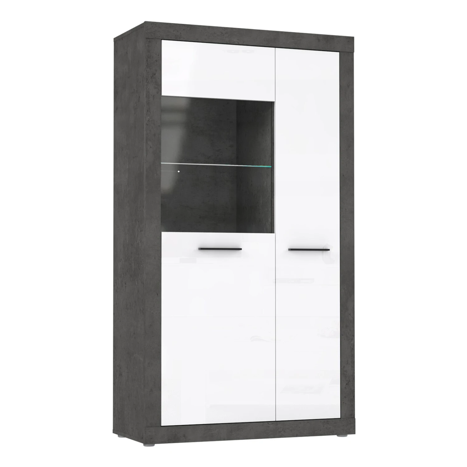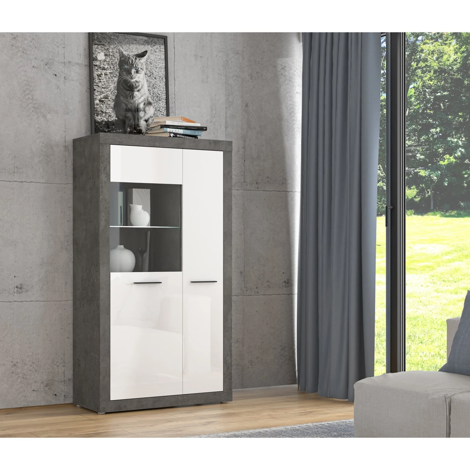 In dieser Highboardvitrine lassen sich entweder Dekoelemente oder andere Gegenstände platzieren. Hinter zwei Türen finden Sie genügend Platz, die weiße Hochglanzfront in Kombination mit dem Korpus in Betonoptik passt in jedes Wohnzimmer.