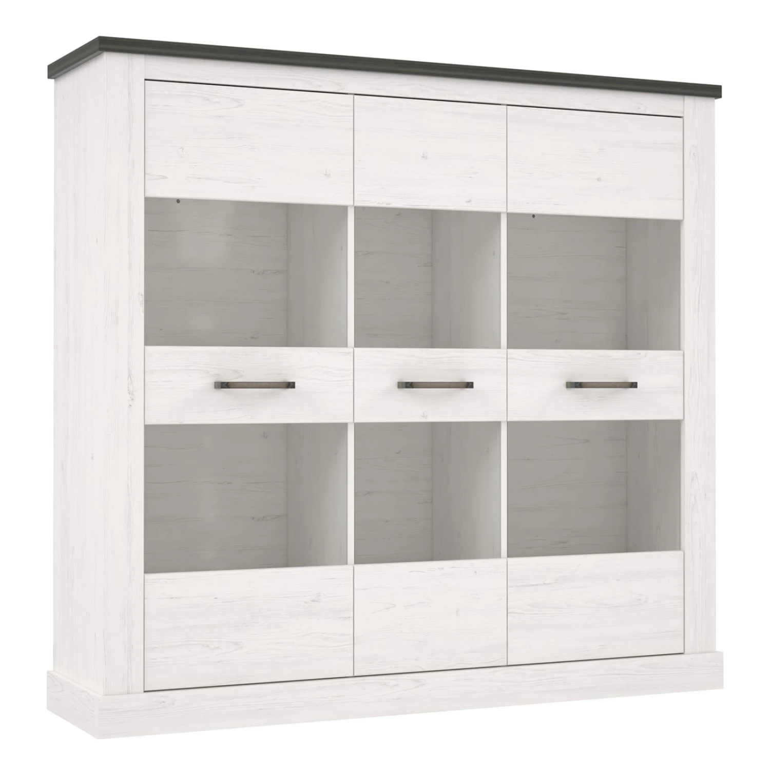 Wunderschöne Highboardvitrine im modernen Landhausstil. Der Korpus ist in Pinie weiß Nachbildung gehalten, der Absatz in Touchwood Nachbildung und die Griffe sind aus gebürstetem Metall. Hinter den drei Türen befinden sich neun Ablageböden aus Holz, die den Innenraum der Virtrine ideal aufteilen und für reichlich Stauraumfläche sorgen.