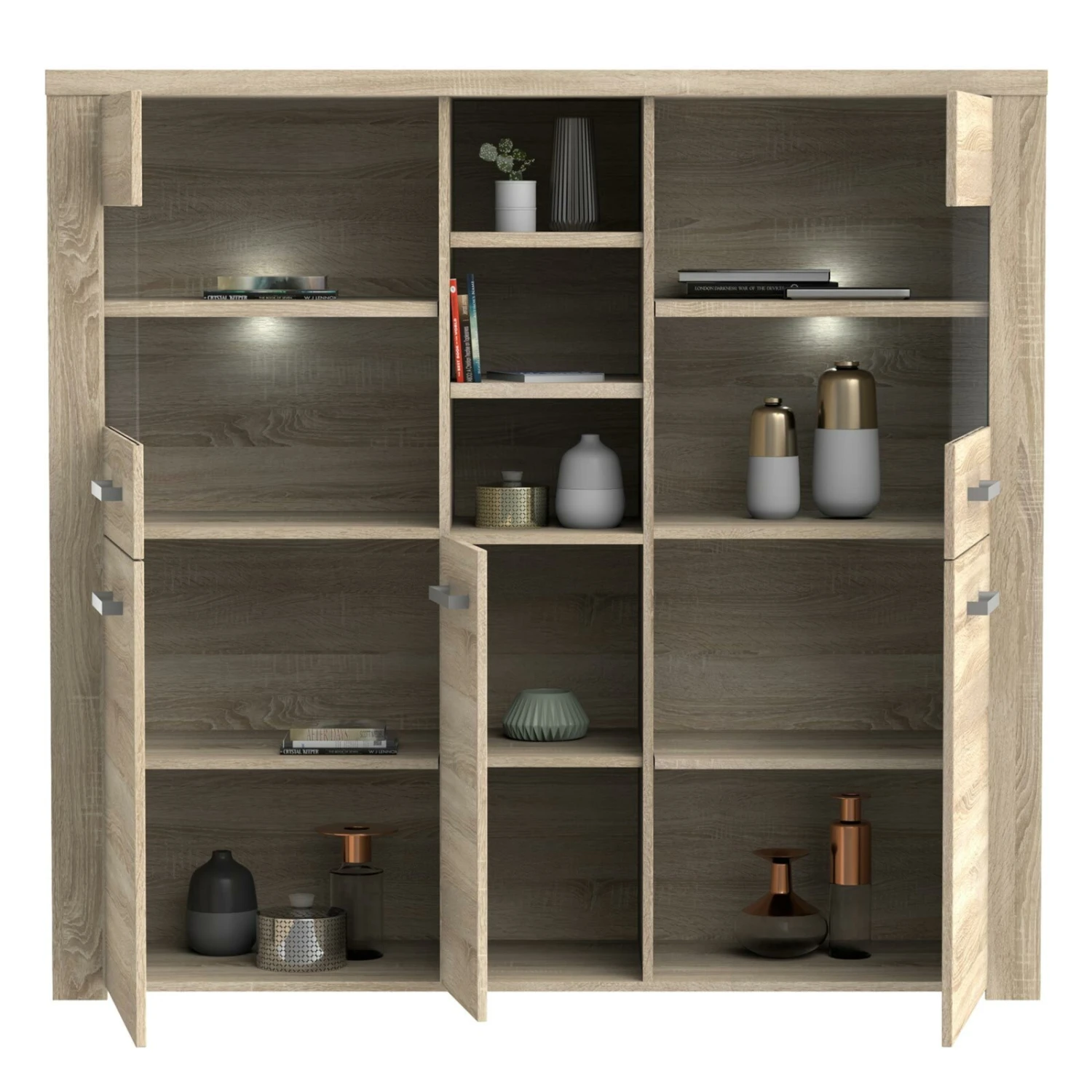 Die Highboardvitrine bietet Ihnen die Möglichkeit, hinter den Glastüren Ihre Dekorationen oder Bilder in Szene zu setzen. Hinter den Holztüren können sämtliche Gebrauchsgegenstände nicht sichtbar untergebracht werden. Insgesamt teilen sechs Einlegeböden die Innenräume perfekt auf, um Ihre Utensilien übersichtlich zu verstauen. Die drei offenen Fächer bieten ebenfalls Platz für Ihre Lieblingsstücke, um diese in Ihrem Wohnraum zu präsentieren.