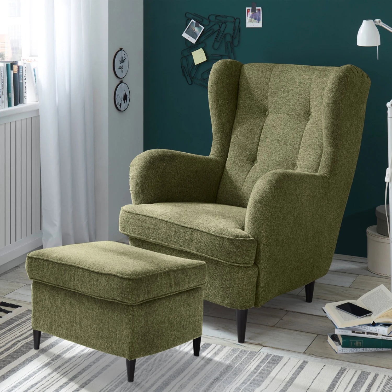 Dieser Polsterhocker in Olive ist ein echter Hingucker und wird das neue farbige Highlight in Ihrem Wohnzimmer werden. Setzen Sie sich einfach in den gleichfarbigen Ohrensessel und legen Sie Ihre Füße auf diesem Polsterhocker ab. Abgerundet wird das farbliche Design durch die schlichten schwarzen Füße aus Massivholz.