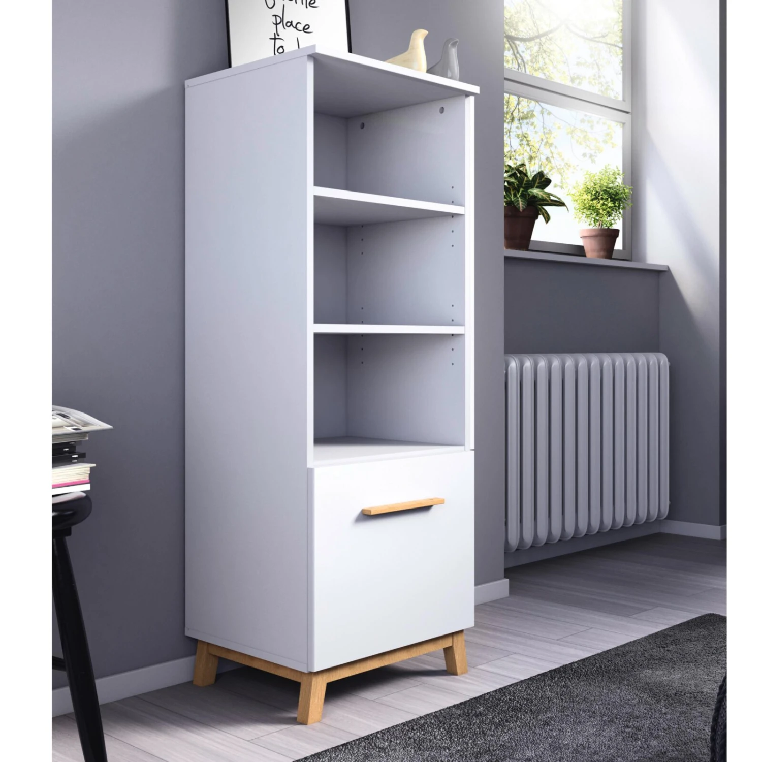 Diese Kommode ist die perfekte Ergänzung zu Ihrem Babyzimmer. Sie ist mit 3 offenen Fächern und einem Schubkasten ausgestattet und bietet somit genug Strauraummöglichkeiten für all Ihre Babyutensilien. Sie überzeugt aber nicht nur durch Ihre Funktionen, sondern auch durch das Design. Die Kommode ist in Alpinweiß gehalten und die Griffe und Füße bestehen aus Eiche Massivholz.