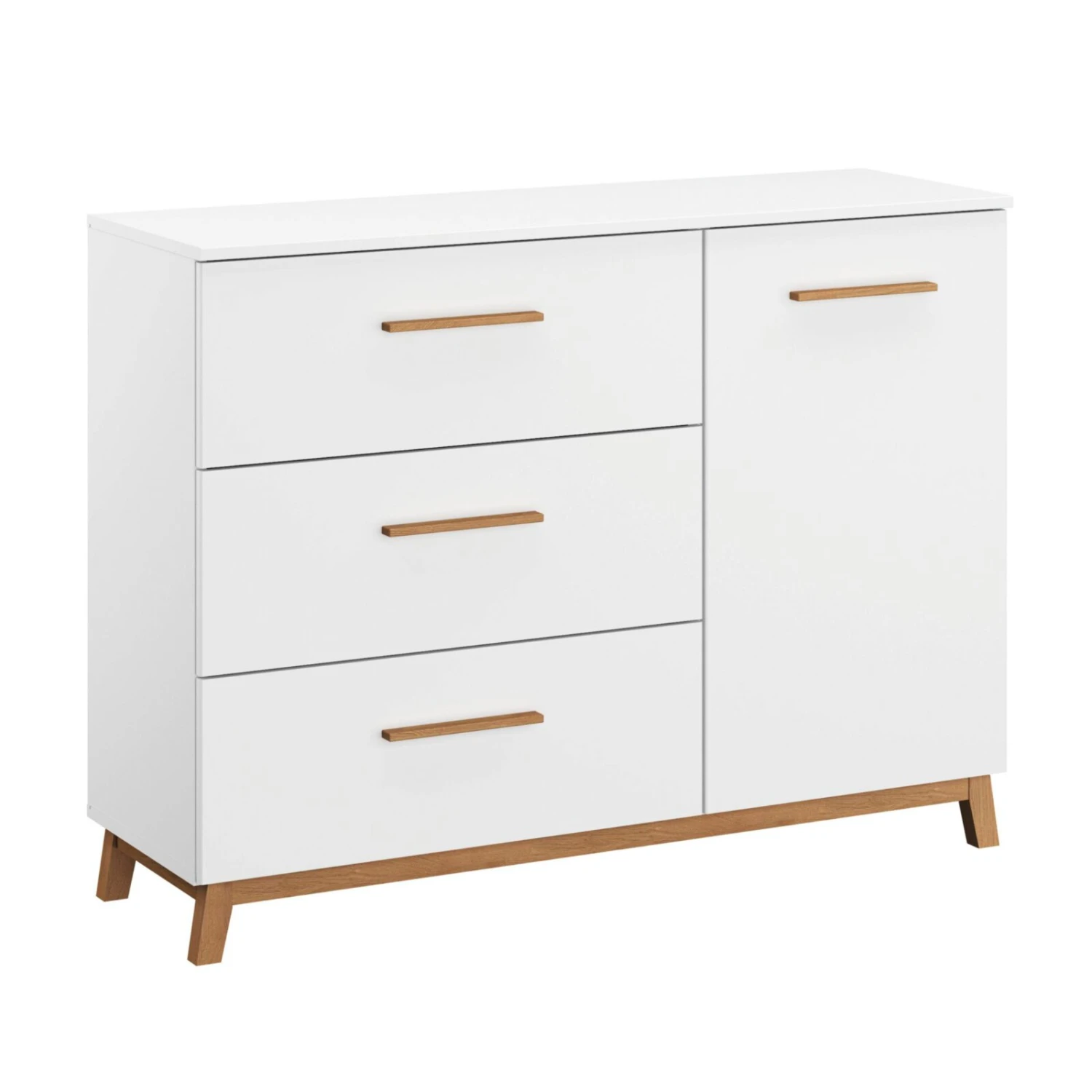 Diese Kommode ist die perfekte Ergänzung zu Ihrem Babyzimmer. Sie ist mit 3 Schubkästen und einer Tür ausgestattet und bietet somit genug Strauraummöglichkeiten für all Ihre Babyutensilien. Sie überzeugt aber nicht nur durch Ihre Funktionen, sondern auch durch das Design. Die Kommode ist in Alpinweiß gehalten und die Griffe und Füße bestehen aus Eiche Massivholz.