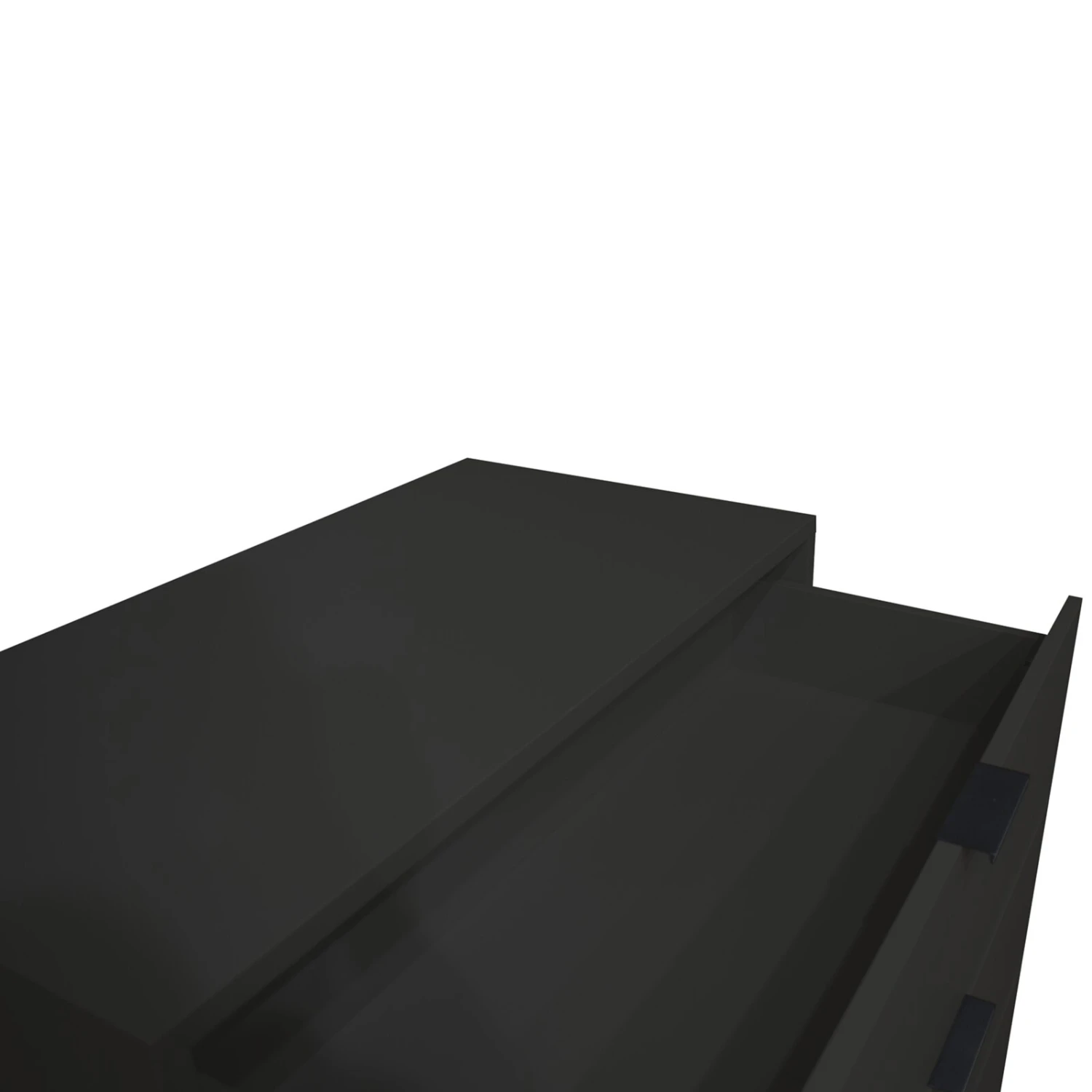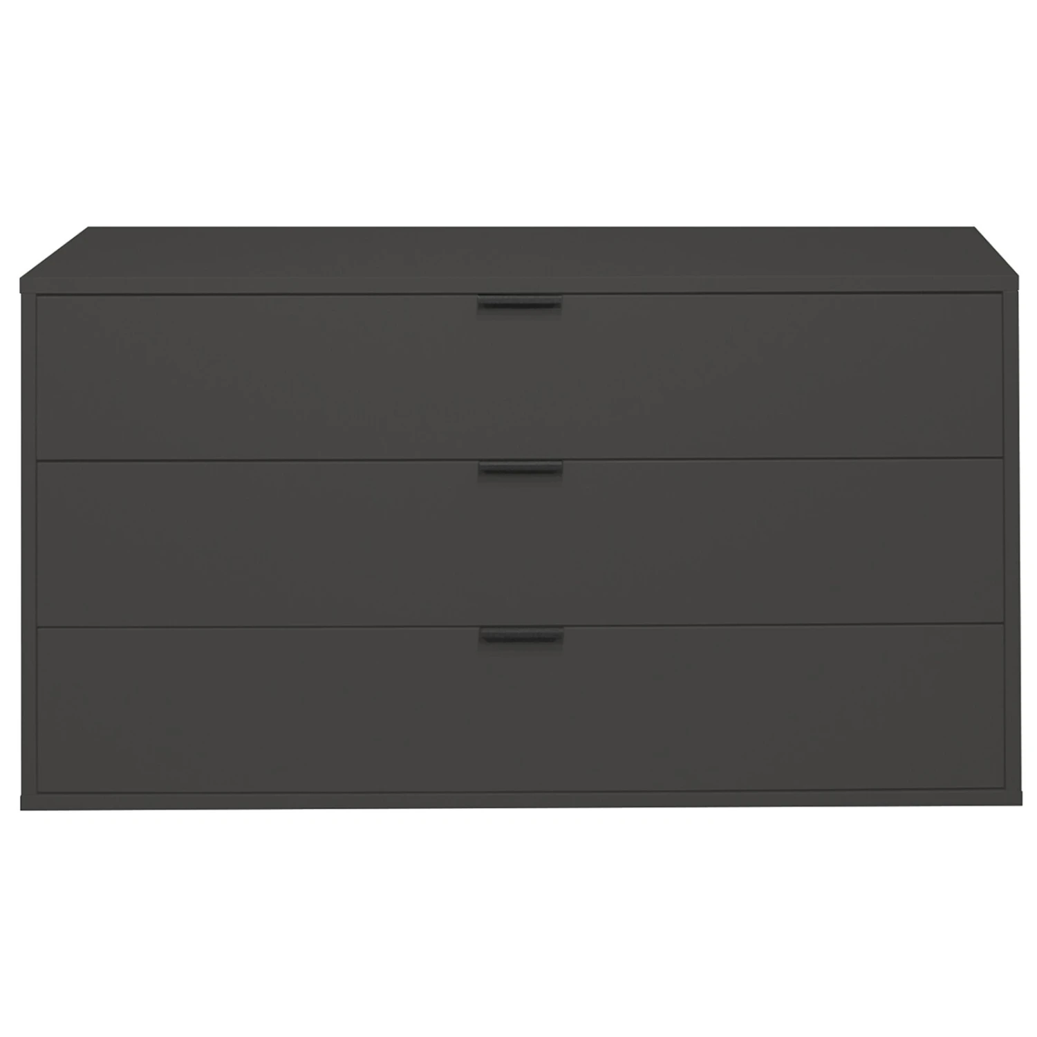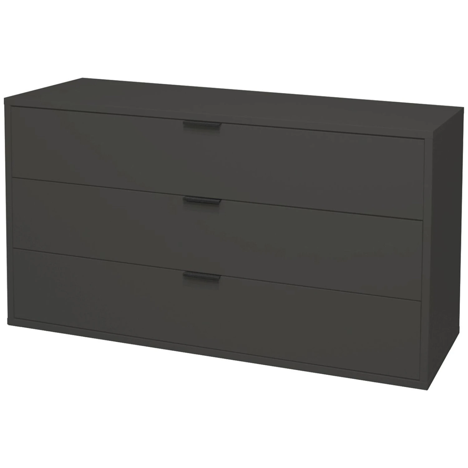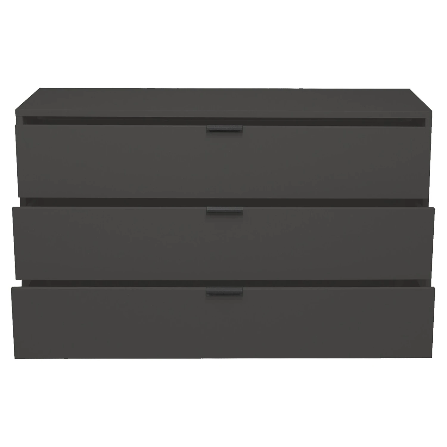 Die etwa 119 Zentimeter breite Kommode bietet dir mit insgesamt drei Schubkästen viele Stauraummöglichkeiten für die verschiedensten Utensilien. Die Farbgebung in Anthrazit lässt sich mit den unterschiedlichsten Einrichtungsstilen kombinieren.