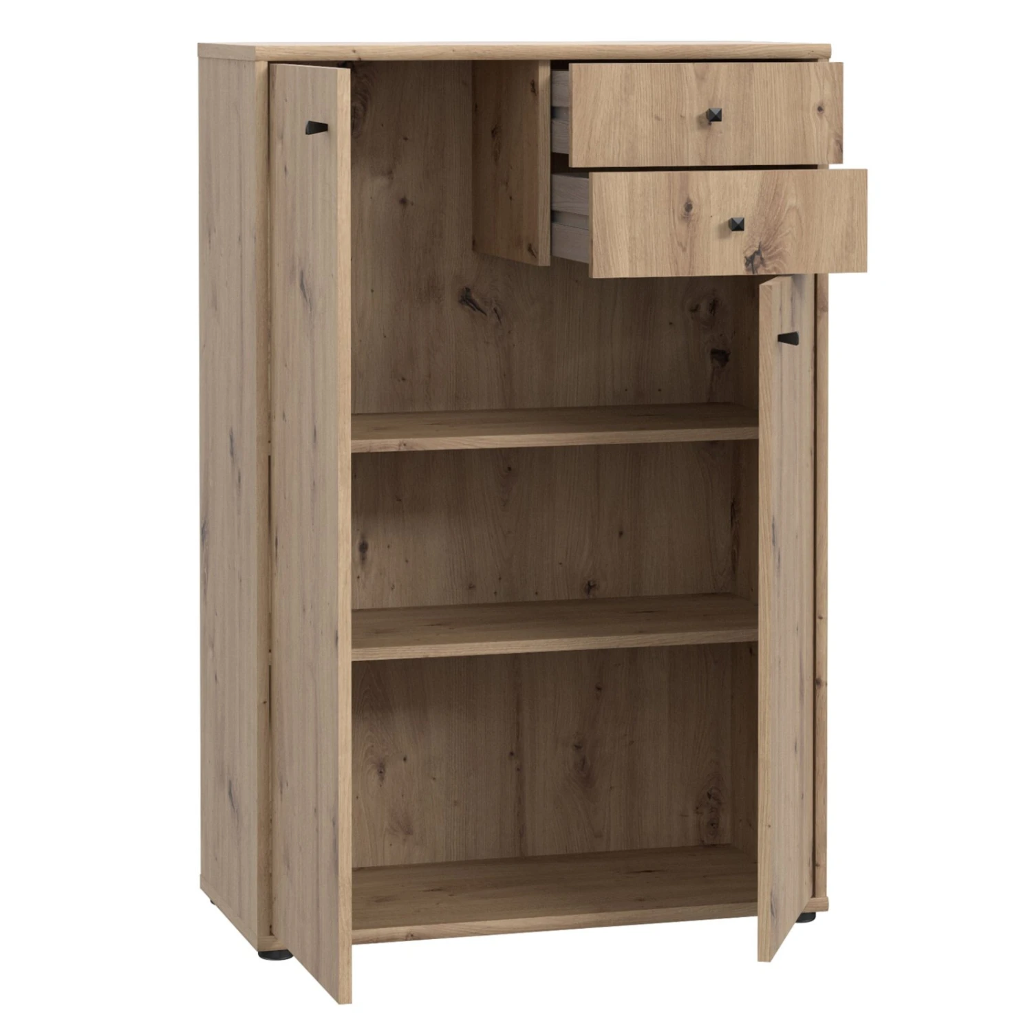 Diese schlichte Kommode in einer Artisan Eiche Nachbildung kann einfach mit anderen Möbeln kombiniert werden und ist somit vielseitig einsetzbar. Darüber hinaus kann der Schrank helfen, Ordnung zu halten, da durch die Einlegeböden, die sich hinter den Türen befinden, für großzügigen Stauraum sorgen. Außerdem sind zwei Schubkästen vorhanden, in denen kleine Utensilien gelagert werden können. Die Türen und Schubkästen lassen sich mit schwarzen Kunststoffgriffen öffnen.