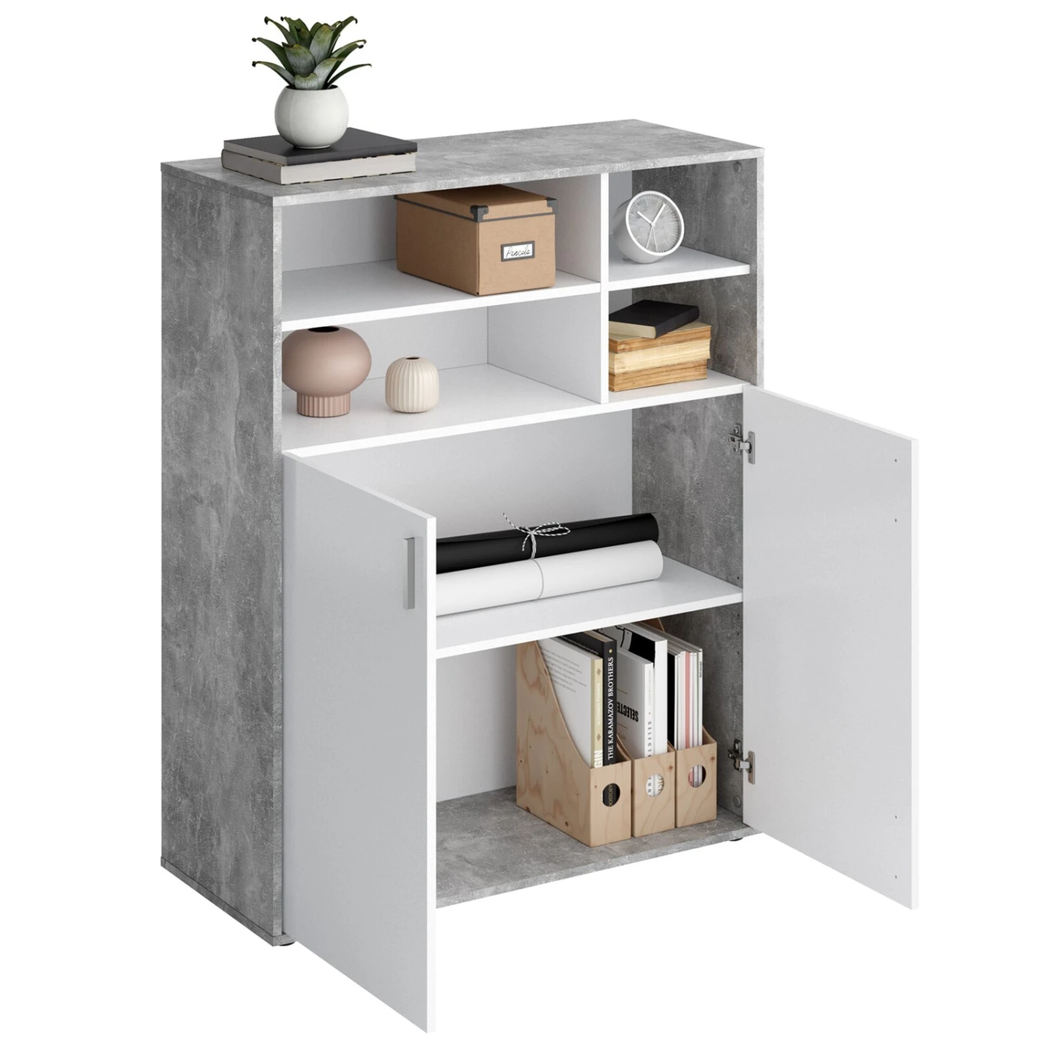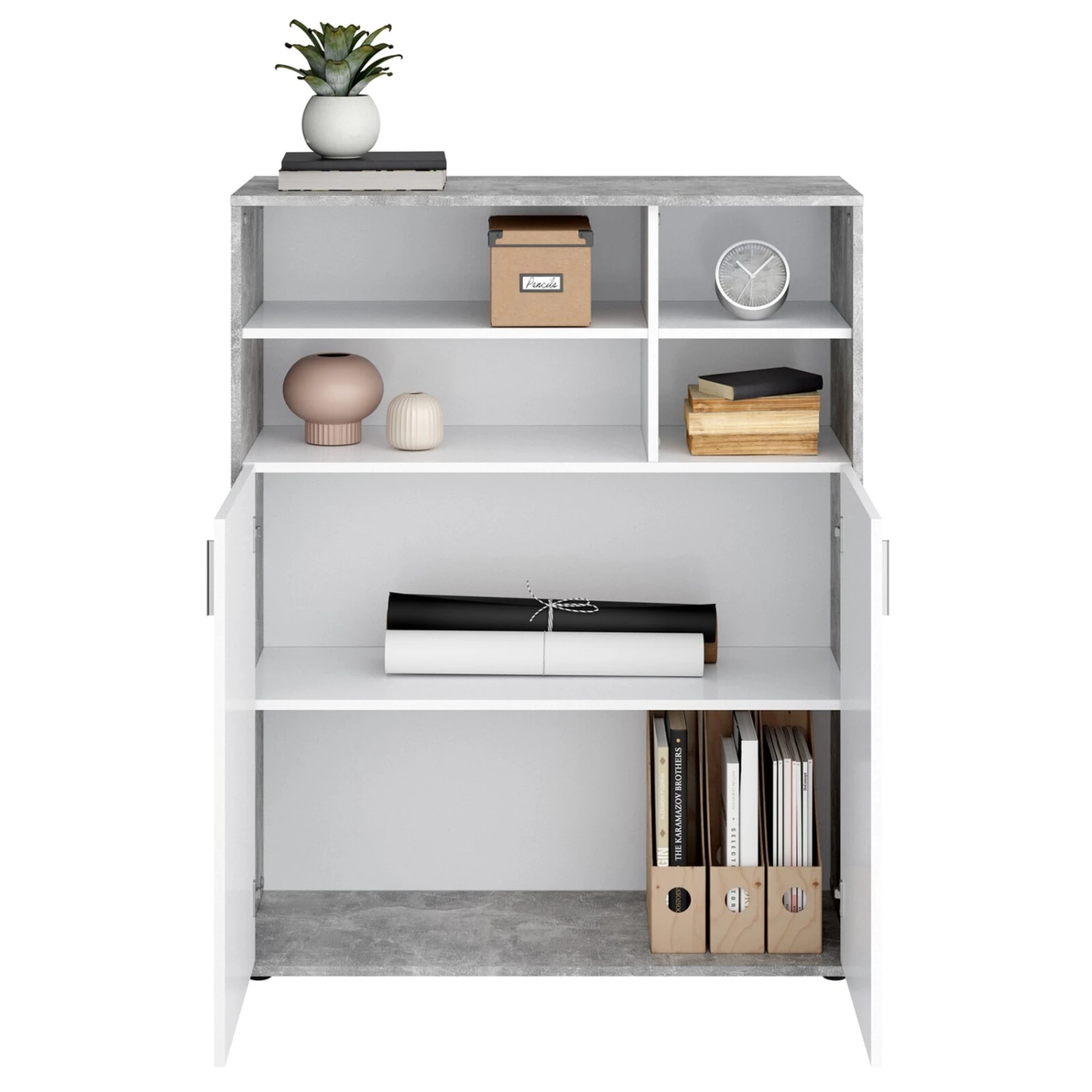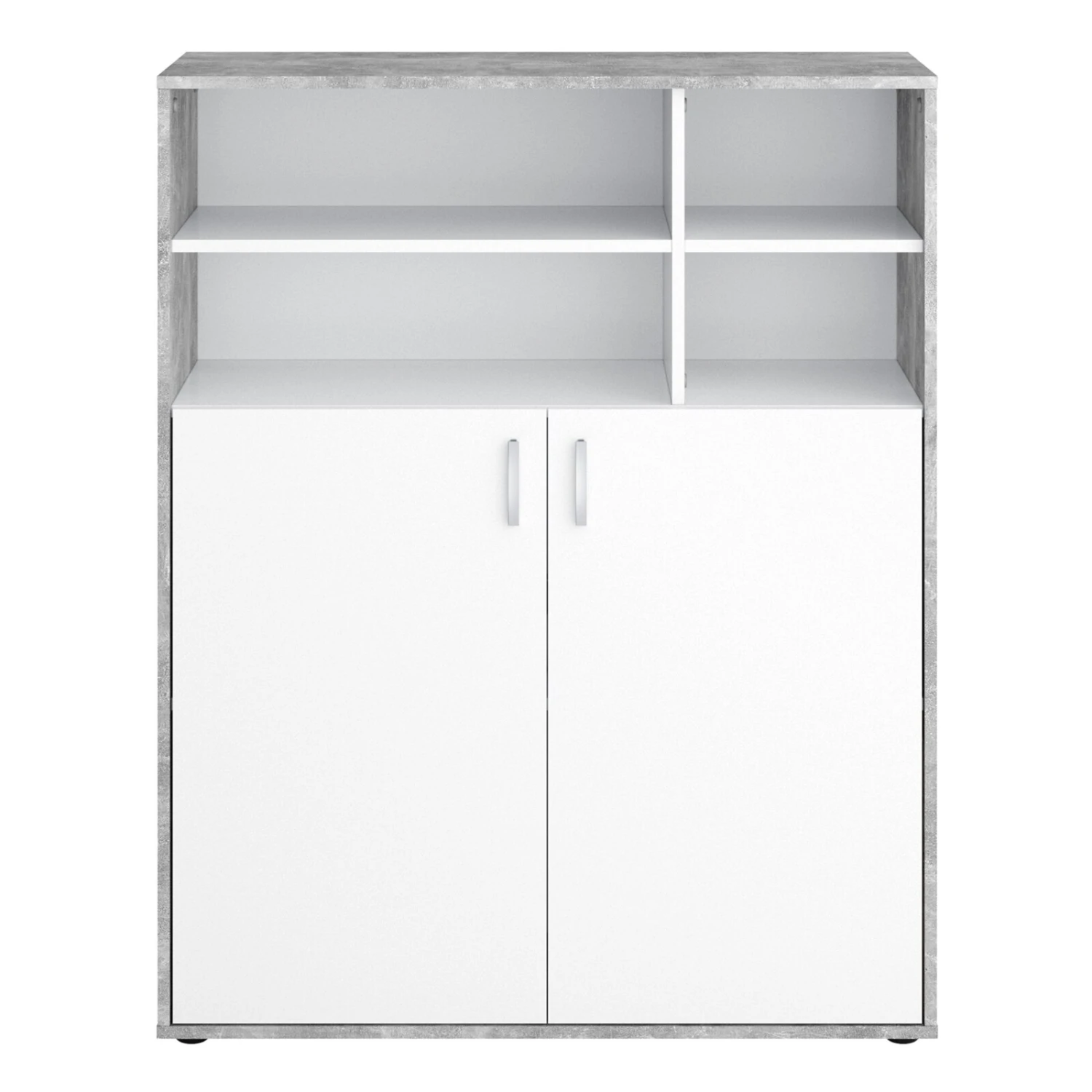 Diese schicke Kommode in moderner Beton Nachbildung und Weiß zaubert ein wohnliches Ambiente in jeden Raum. Hinter zwei Türen und in vier offenen Fächern lassen sich Dekorationsartikel und Unterlagen verstauen. Egal, ob im Büro, im Flur oder im Wohnzimmer – diese Kommode macht immer eine gute Figur.