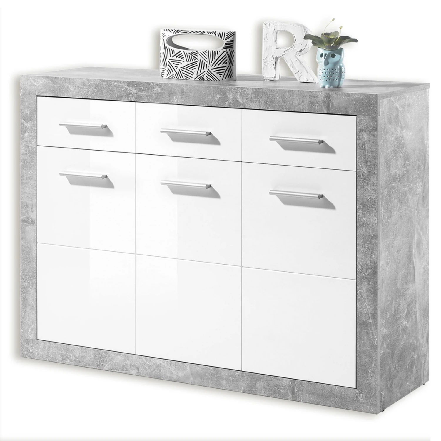 Für reichlich Stauraummöglichkeiten sorgt diese moderne Kommode. Der Mix aus Beton-Optik und hochglänzendem Weiß macht dieses Möbelstück zum echten Hingucker. Abgerundet wird das Ganze von den silbernen Kunststoffgriffen, die dieser Kommode noch das gewisse Etwas verleihen.