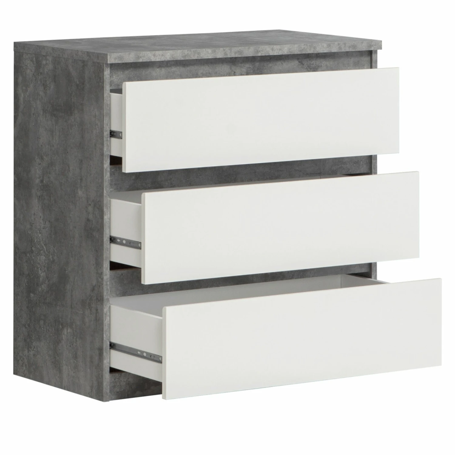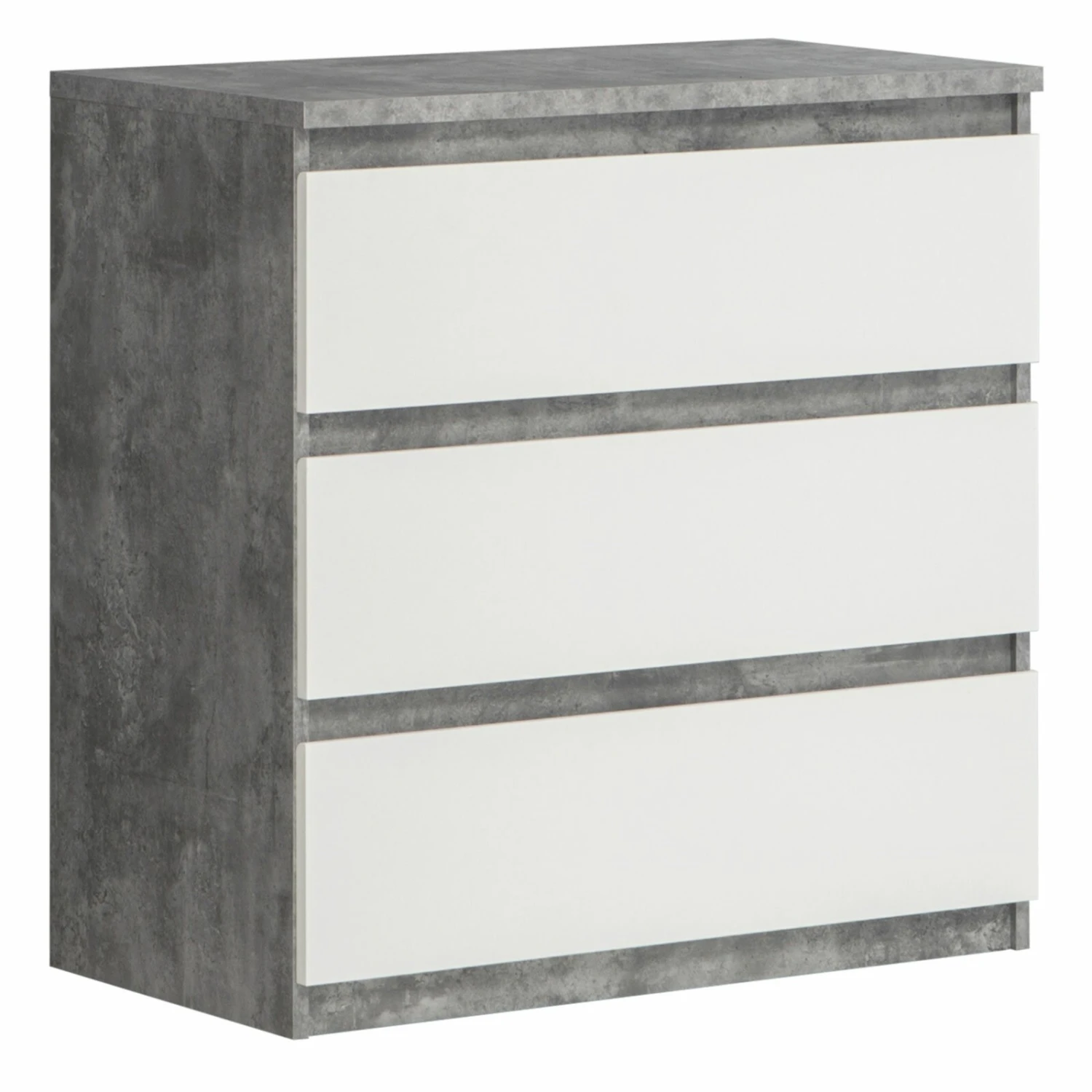 Diese Kommode, die in Betonoptik und Weiß gehalten ist, bietet mit ihren großen Schubfächern eine sehr gute Möglichkeit Verschiedenes zu verstauen.