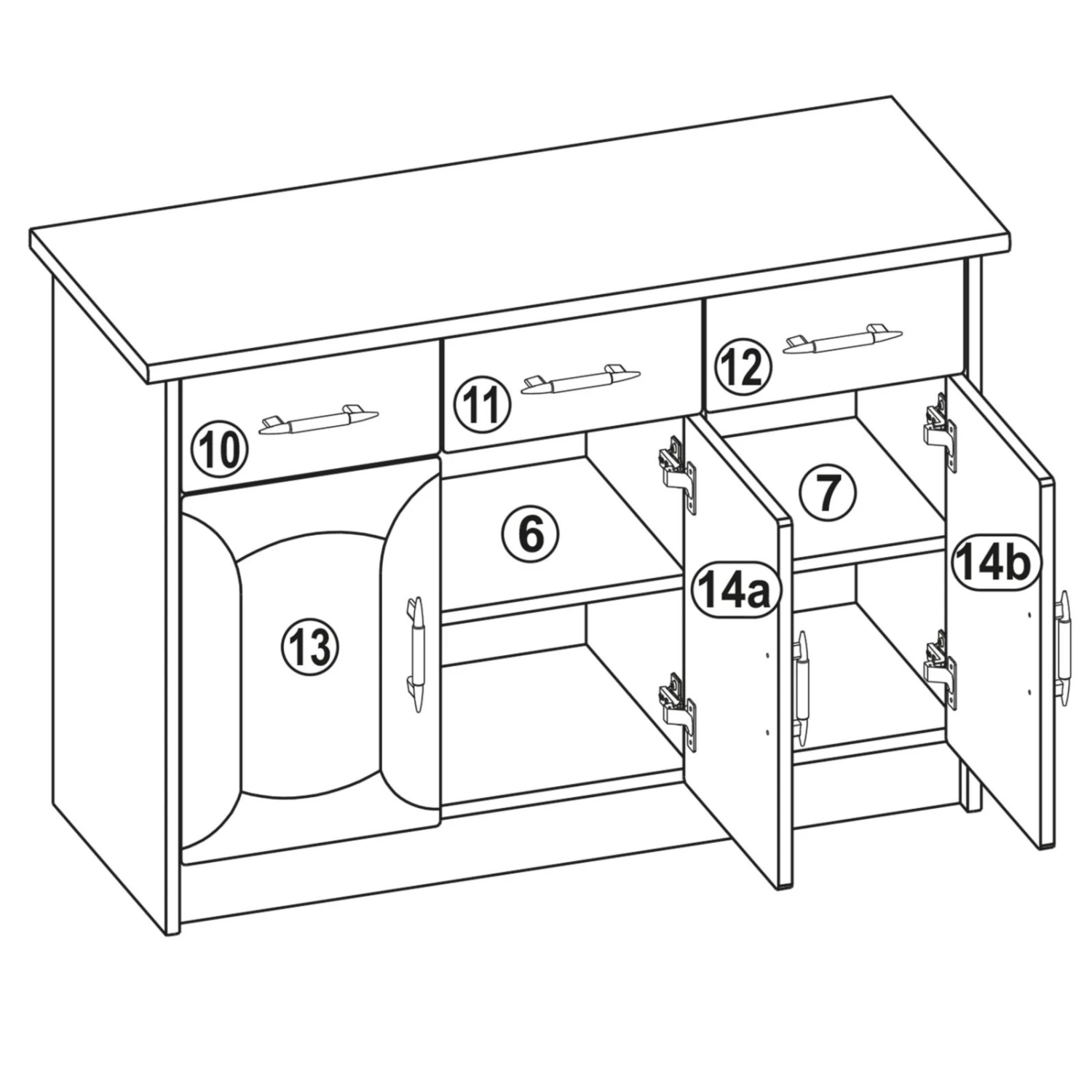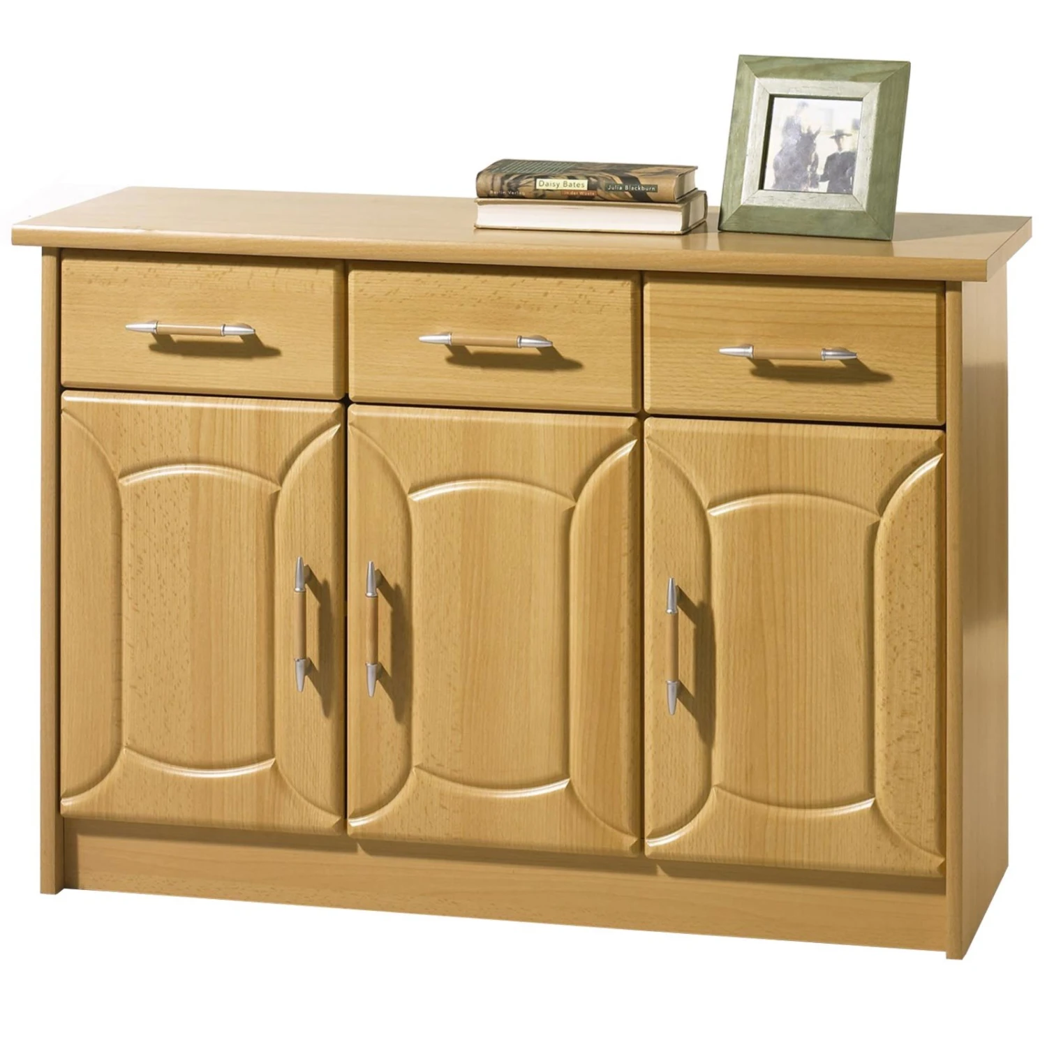 In zeitloser Buche Nachbildung präsentiert sich diese etwa 101 Zentimeter breite Kommode, die für reichlich Stauraummöglichkeiten sorgen wird. Diese finden Sie in drei Schubkästen und hinter drei Türen, deren Innenräume von Einlegeböden praktisch aufgeteilt werden.