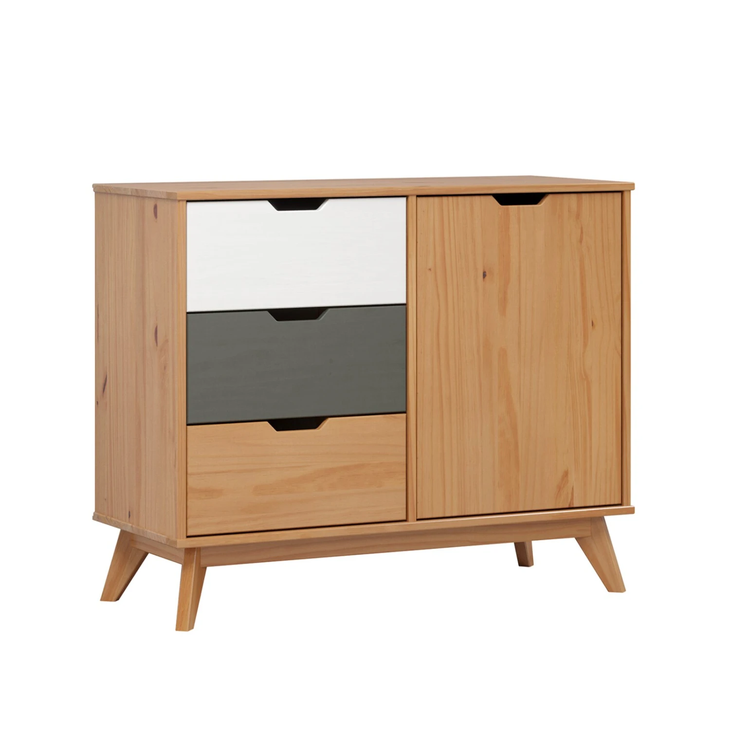 Die Kommode ist ein wahres Multitalent. Ob im Flur, im Schlafzimmer oder im Wohnzimmer – sie passt einfach in jeden Raum und bietet mit drei Schubkästen und einer Tür viel Platz zum Verstauen.