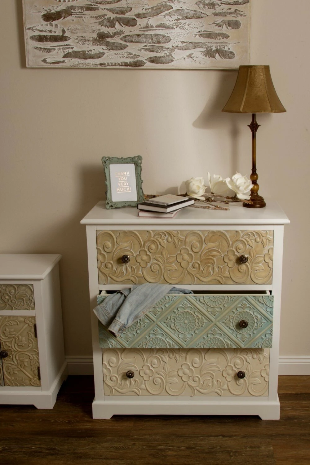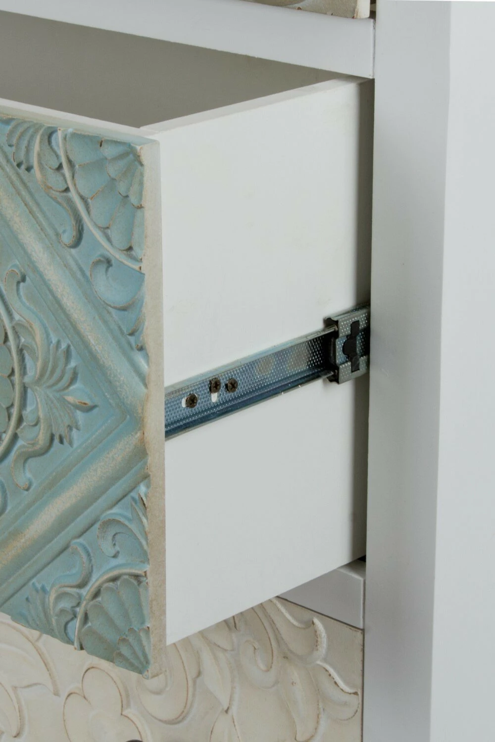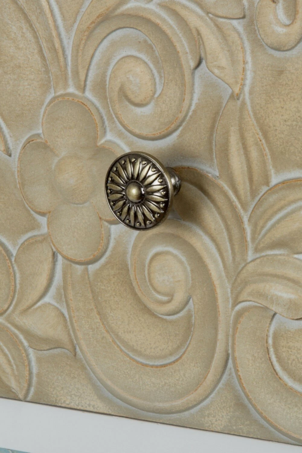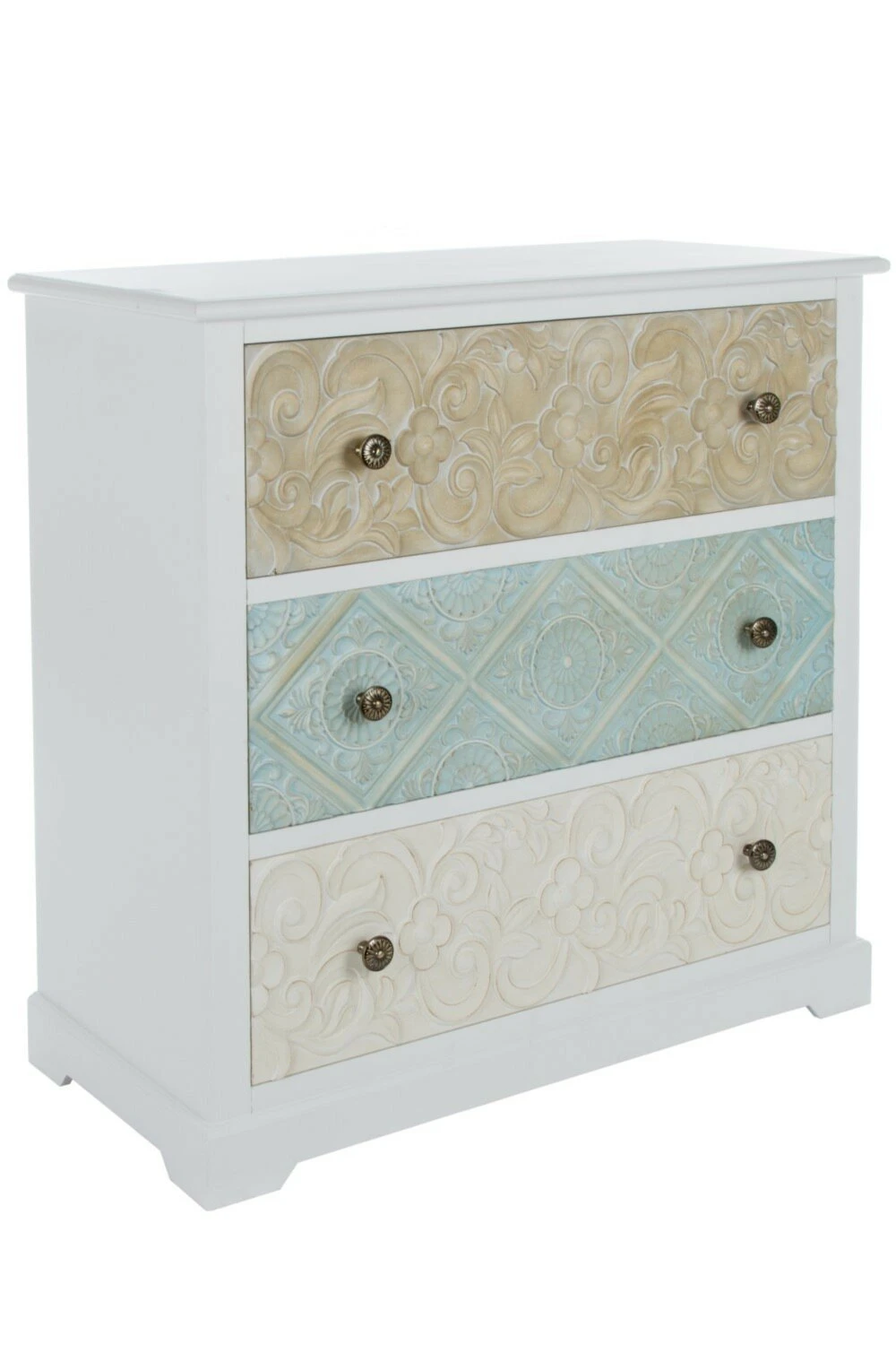 Die pastellfarbenen Schubkastenfronten der Kommode INEZ sind mit einem modellierten Muster versehen, die diesem Stauraumwunder eine umwerfende Optik verleihen. So erlangt das Möbelstück seinen ganz eigenen Charme, der sich in Ihrem Zimmer widerspiegeln wird. Die floralen Metallgriffe runden das tolle Gesamtbild stimmig ab.