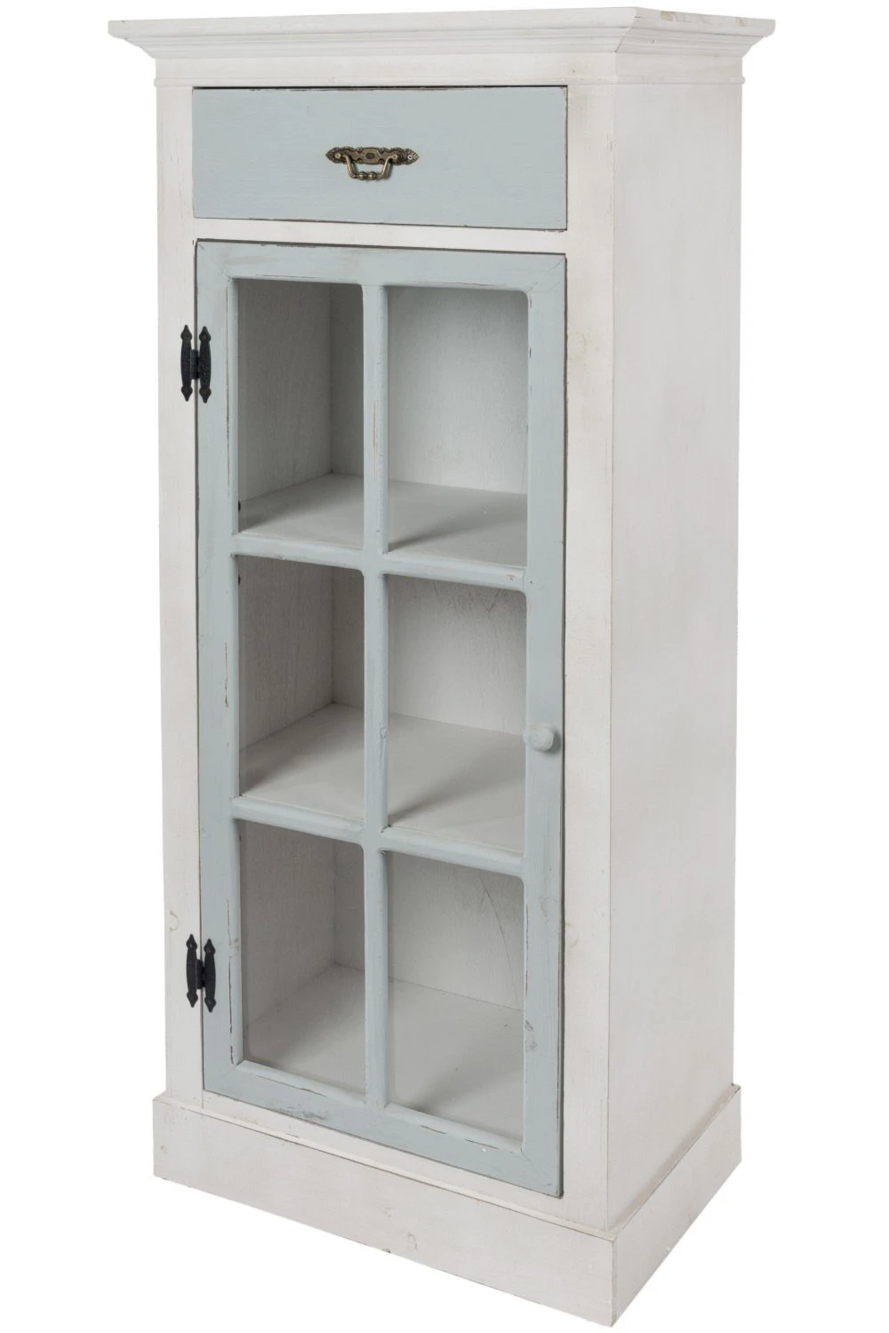 Die Kommode JUAN ist mit einer Glastür bestückt. Dahinter befinden sich zwei Einlegeböden. Die Griffe und Scharniere sind aus Metall und mit Liebe zum Detail.