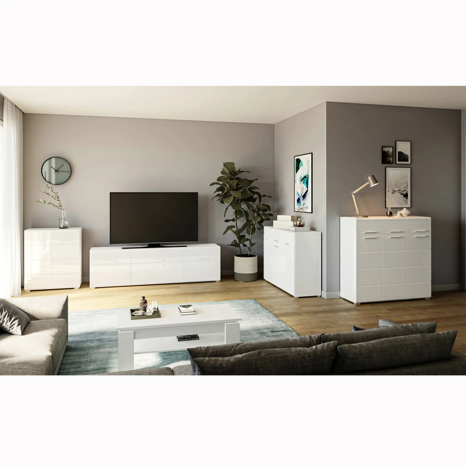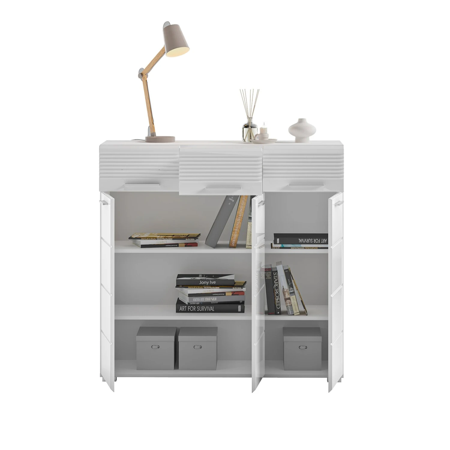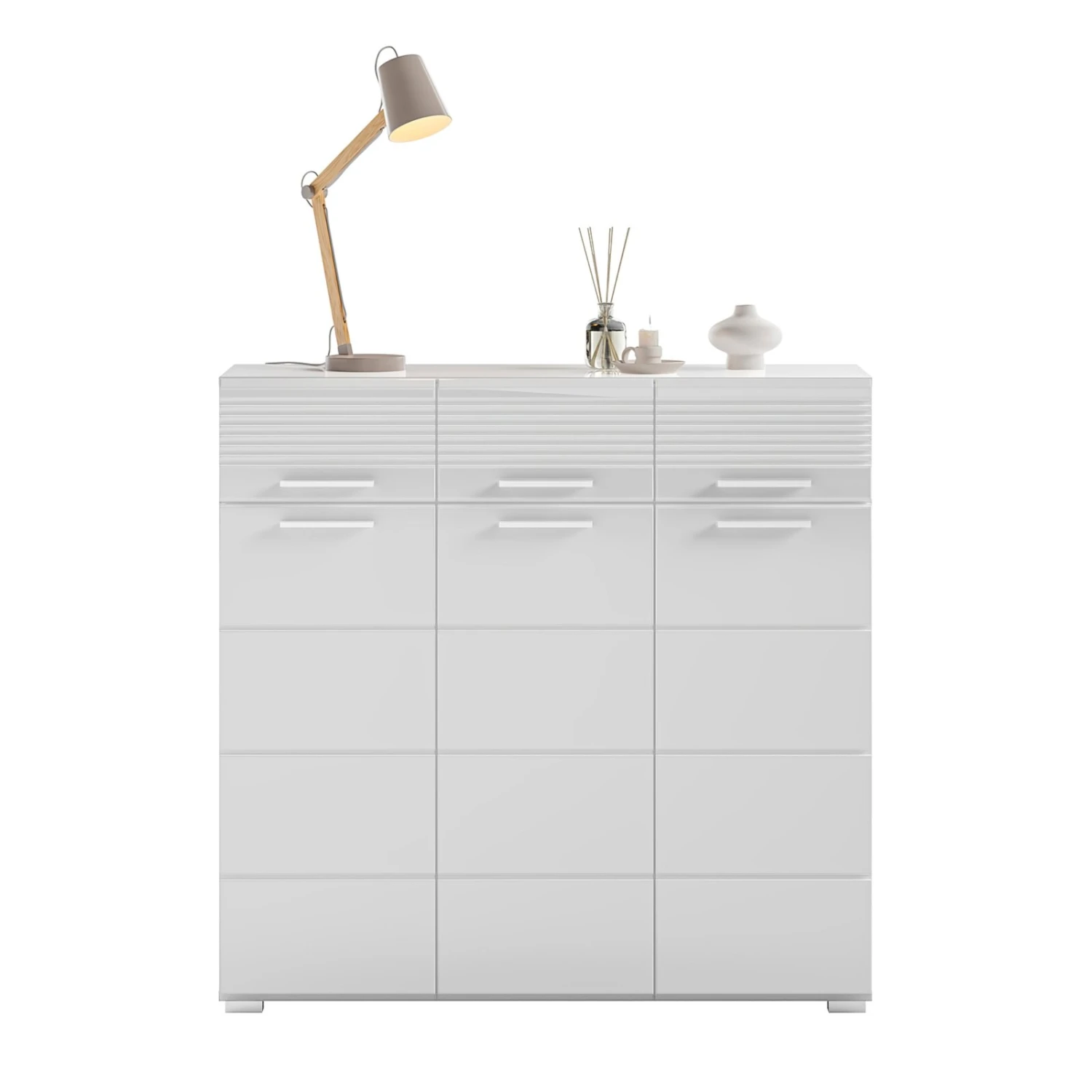 Diese einfache Kommode mit Fronten in Weiß Hochglanz passt in jeden Raum, egal ob Wohn-, Schlaf- oder dem Esszimmer. Die Griffe und Füße der Kommode sind alufarbig und runden das schlichte Design zusätzlich ab. Kleinere Utensilien kannst du problemlos in den drei Schublade unterbringen. Größere Gegenstände finden hingegen hinter den drei Türen ihren Platz.