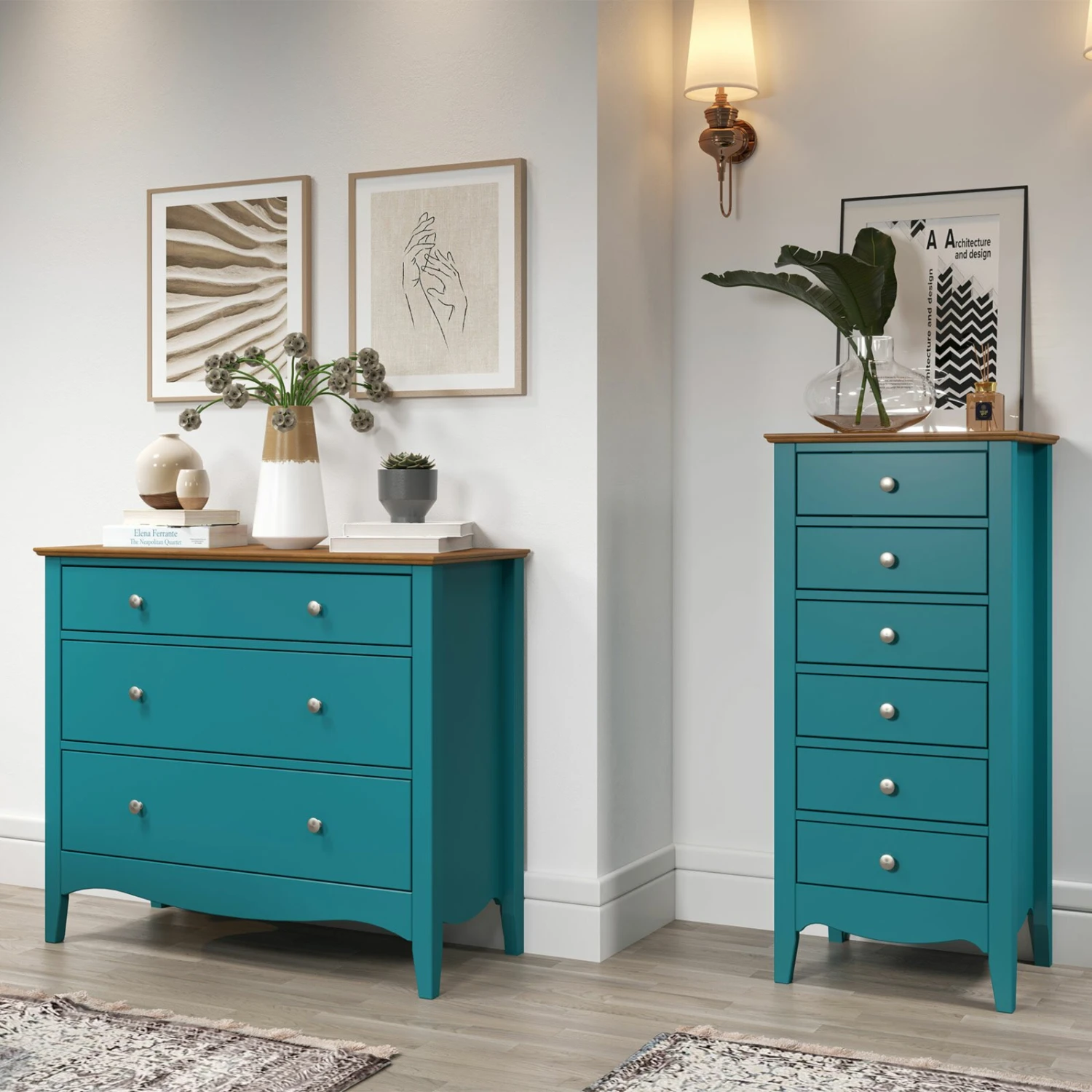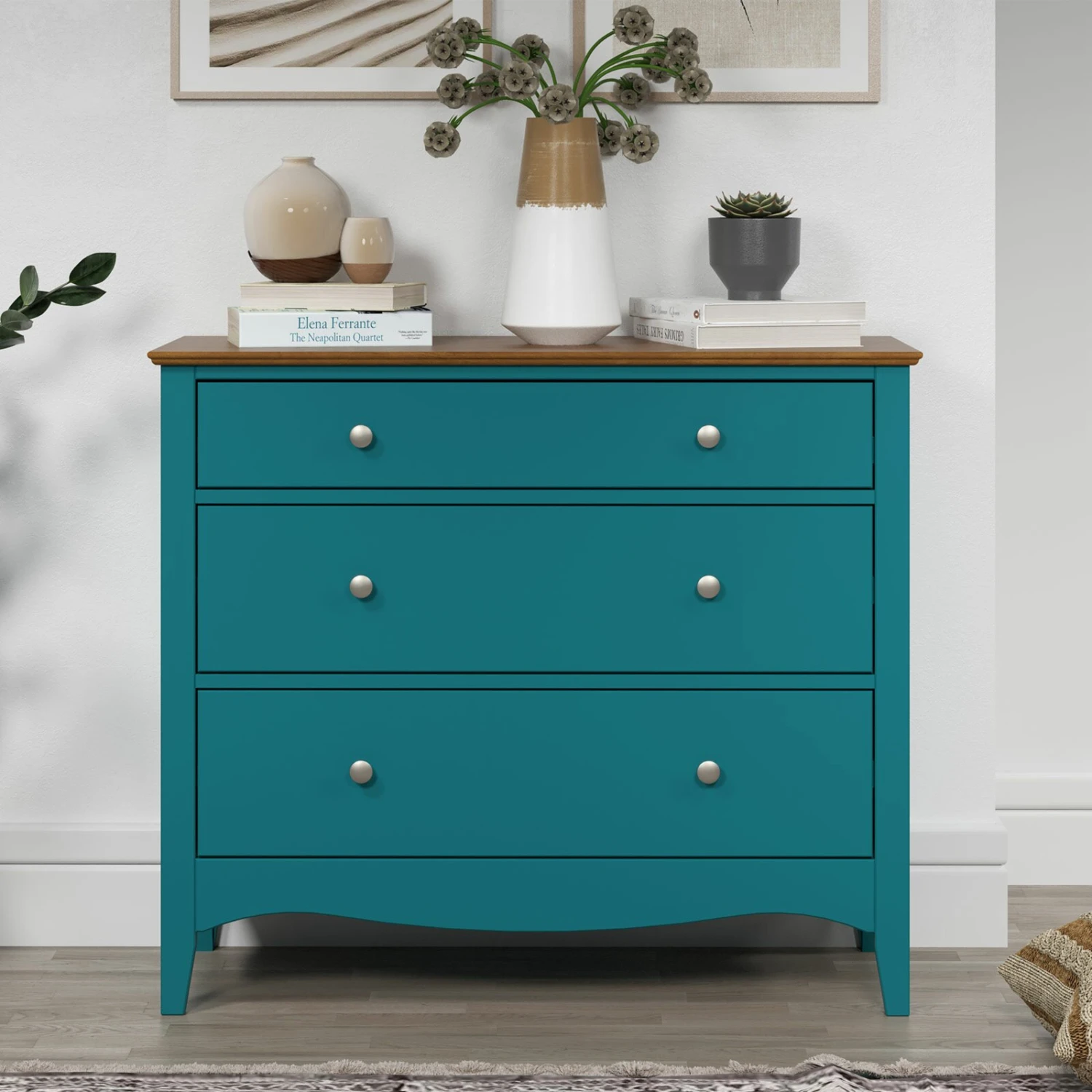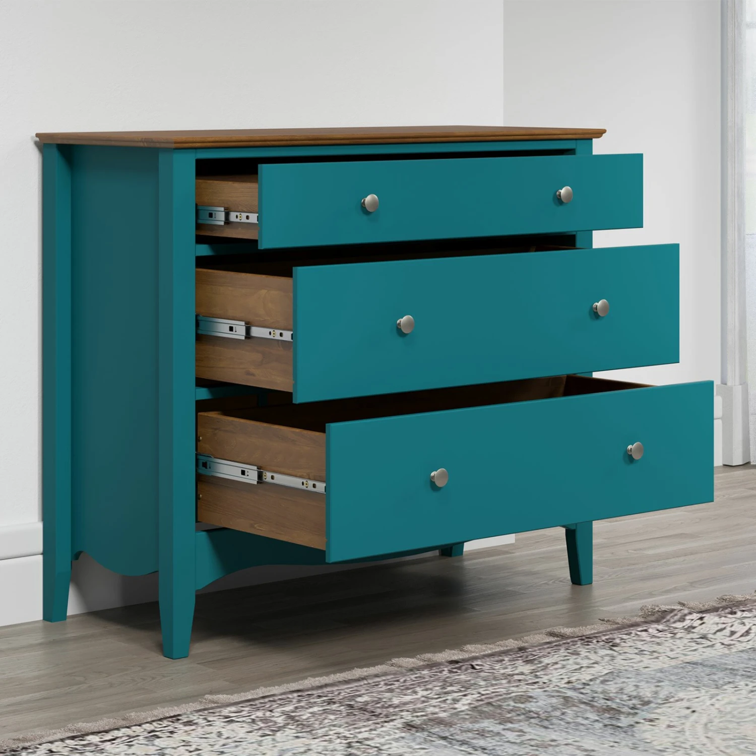 Die Kommode aus teilmassiven Kieferholz bietet neben der bezaubernden Optik, genügend Stauraummöglichkeiten wegen der drei Schubkästen mit vollem Auszug. Außerdem verleiht Sie aufgrund der Metallknöpfe die an den Schubkästen versehen sind, eine edle Atmosphäre.