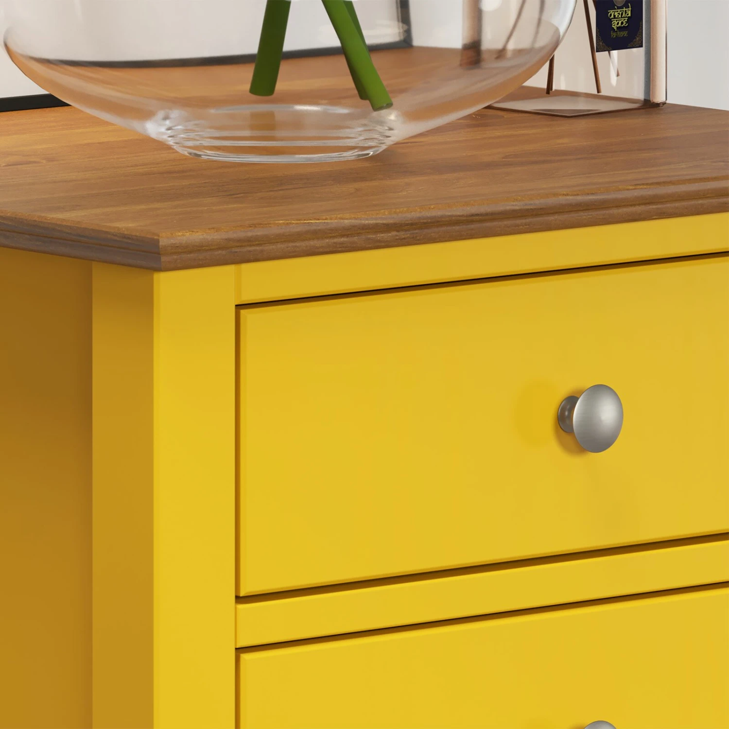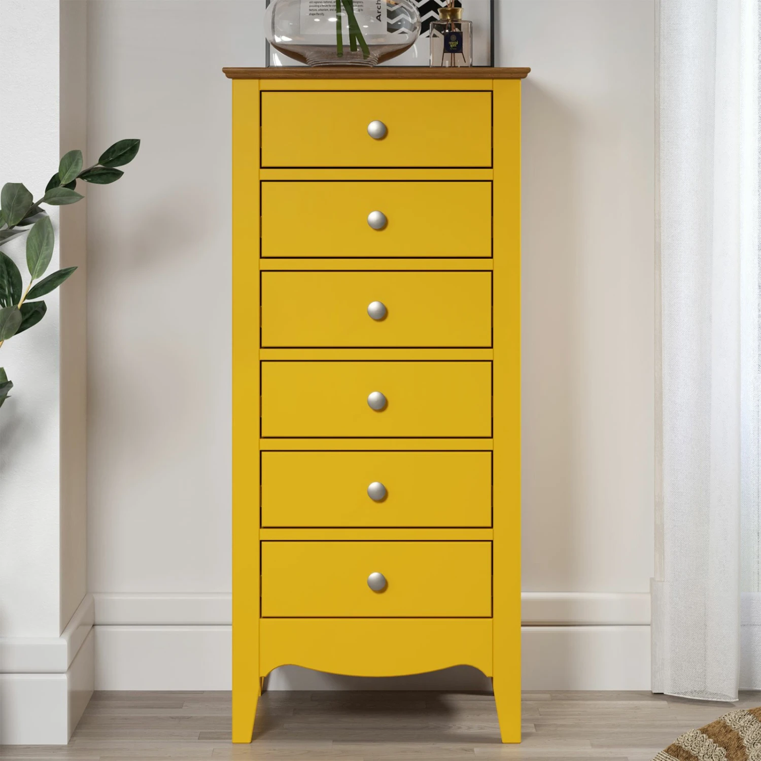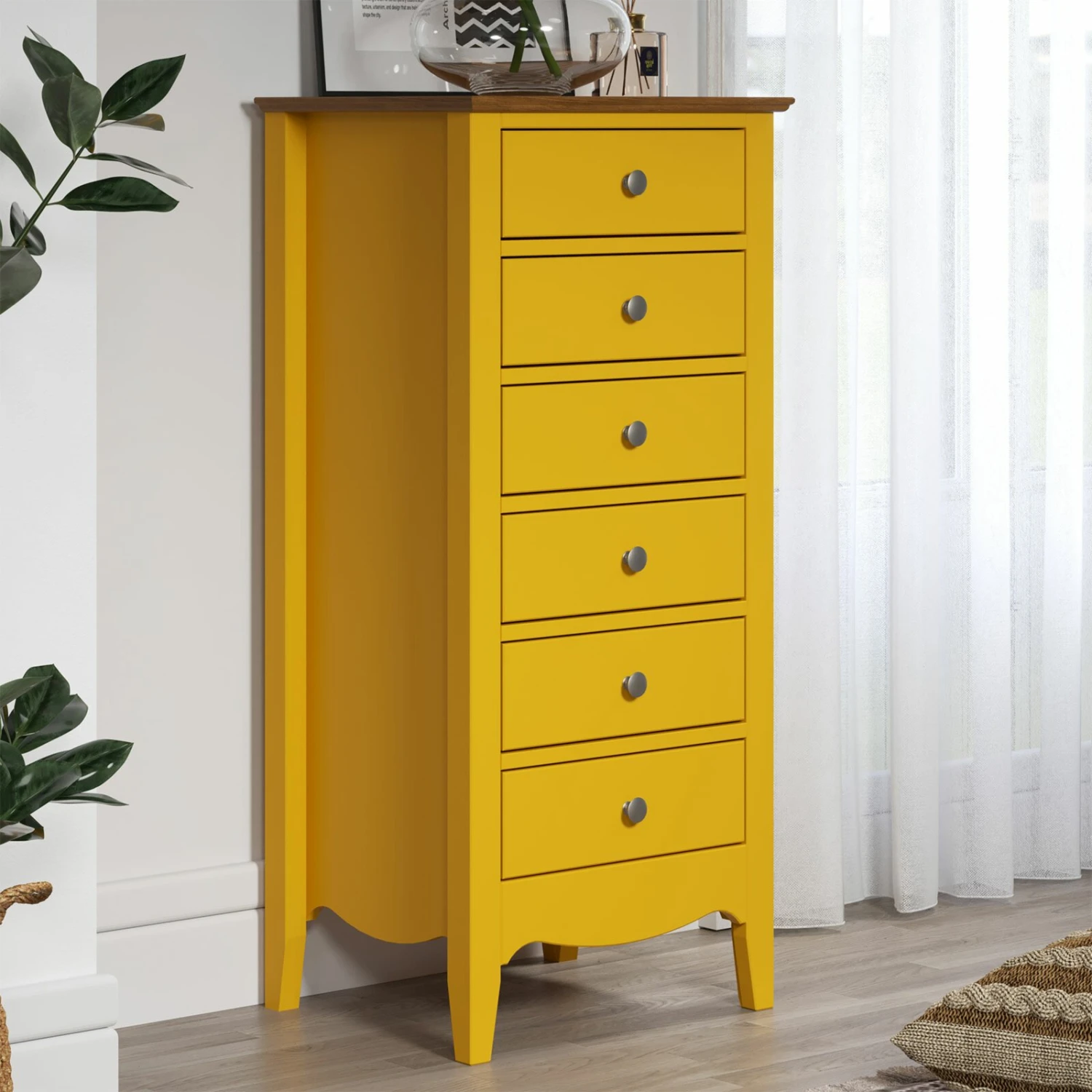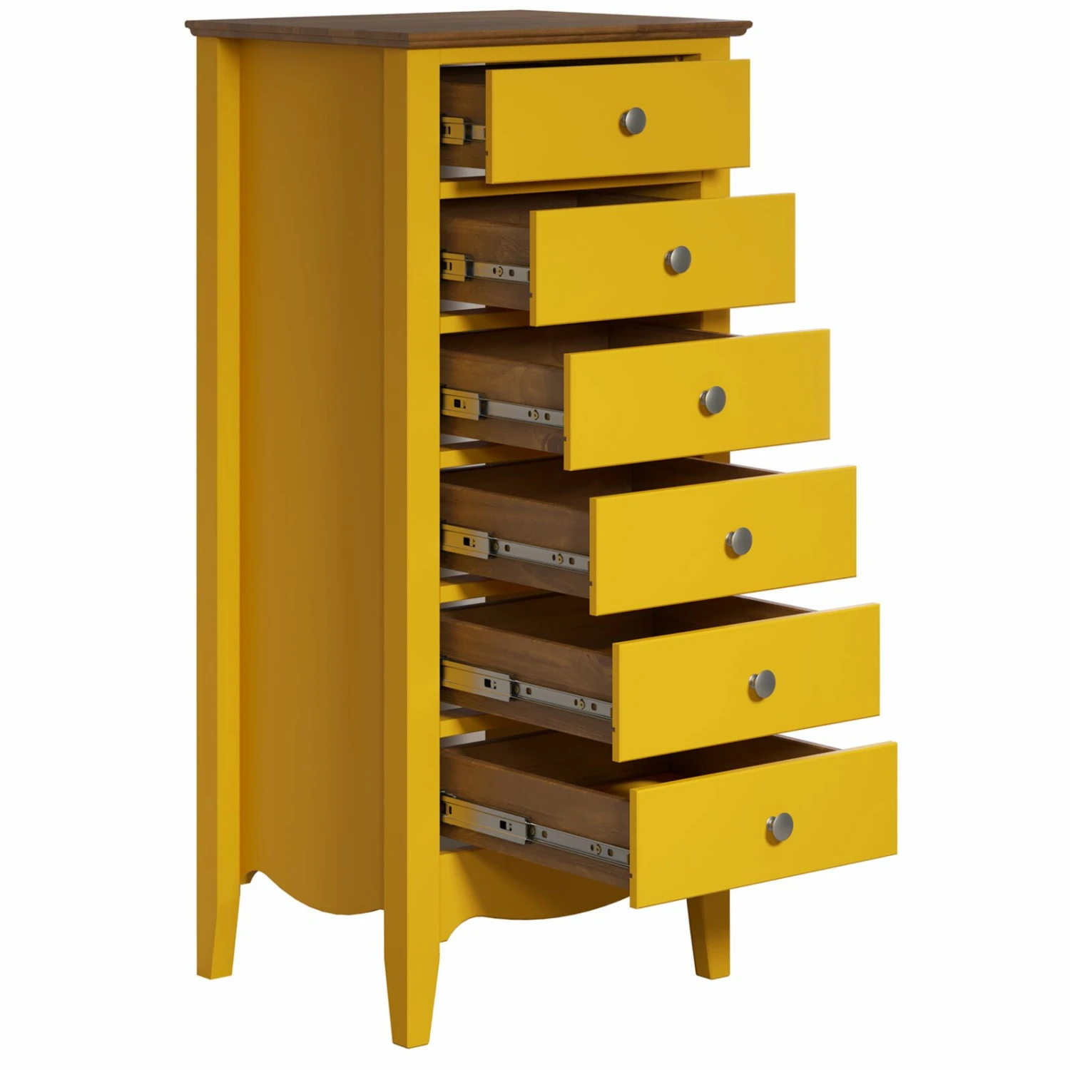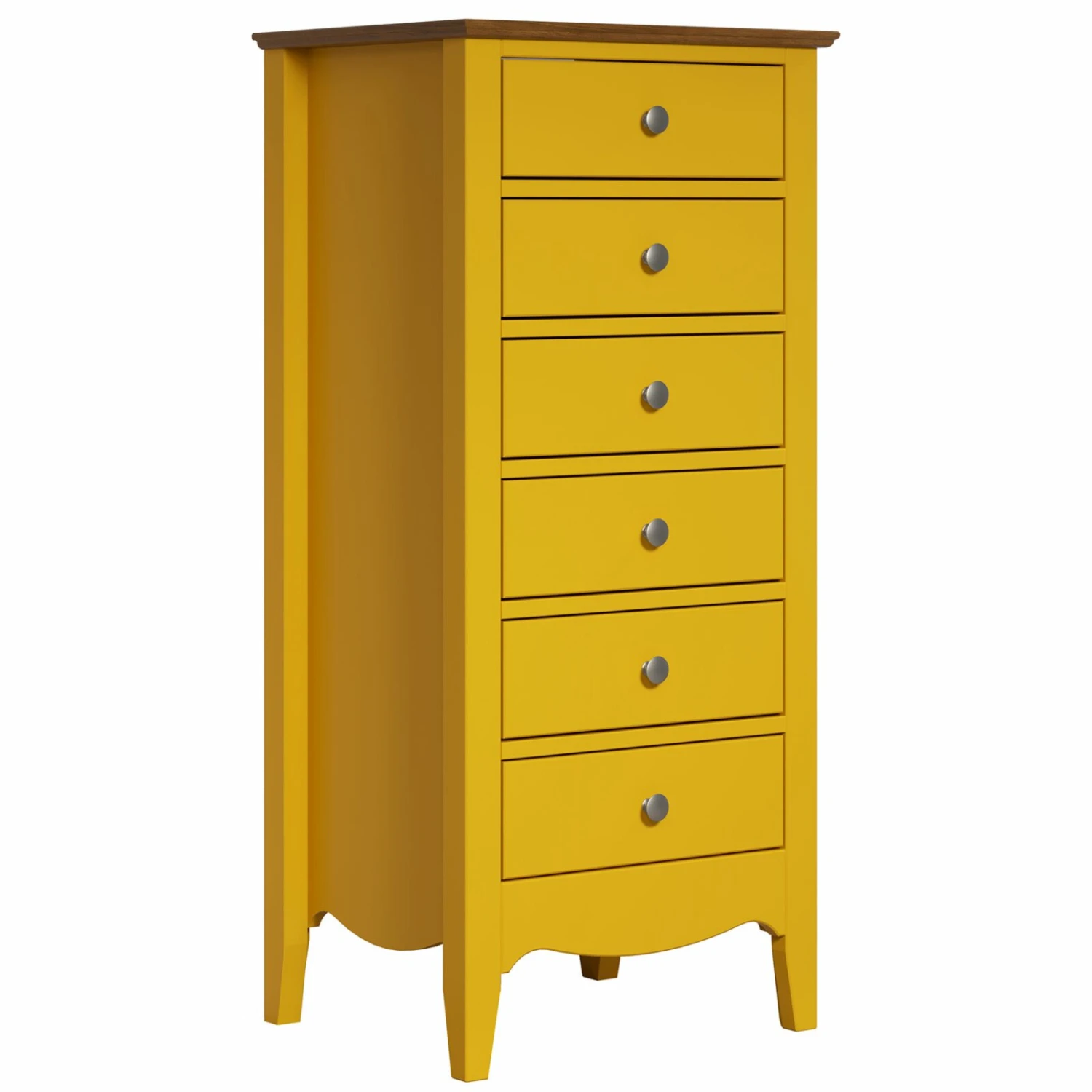 Diese Kommode bringt Ihnen ein sommerliches Ambiente nach Hause. Mit dem strahlenden Gelb verleiht Ihn diese Kommode sowohl eine wundervolle Optik als auch eine hochwertige Qualität, denn das Material von der Kommode besteht aus teilmassiven Kieferholz. Aufgrund der sechs Schubkästen mit einem vollen Auszug brauchen Sie sich keine Sorgen über Sortier- und Stauraummöglichkeiten zu machen. Darüber hinaus wurden an den Schubkästen Metallknöpfe verbaut, um die Optik aufzuwerten.