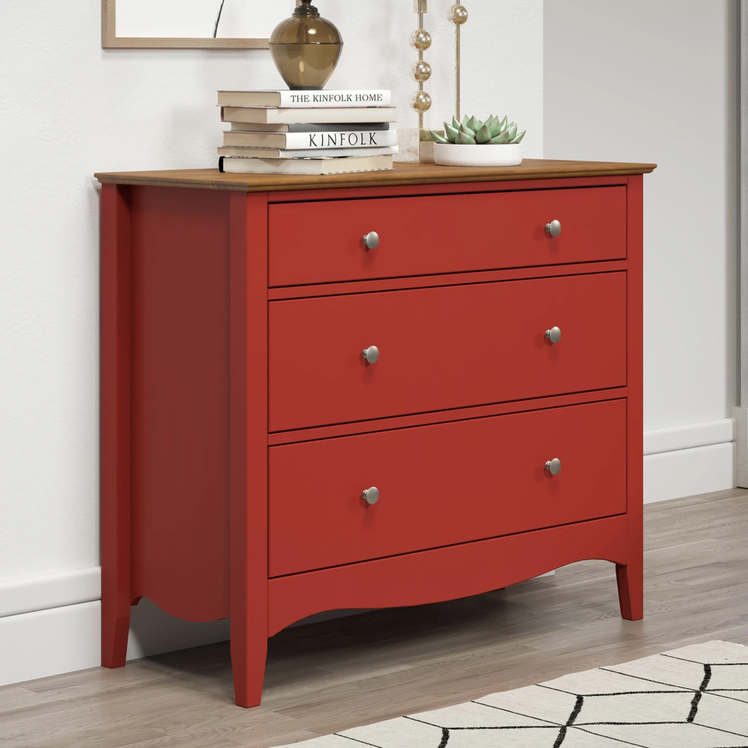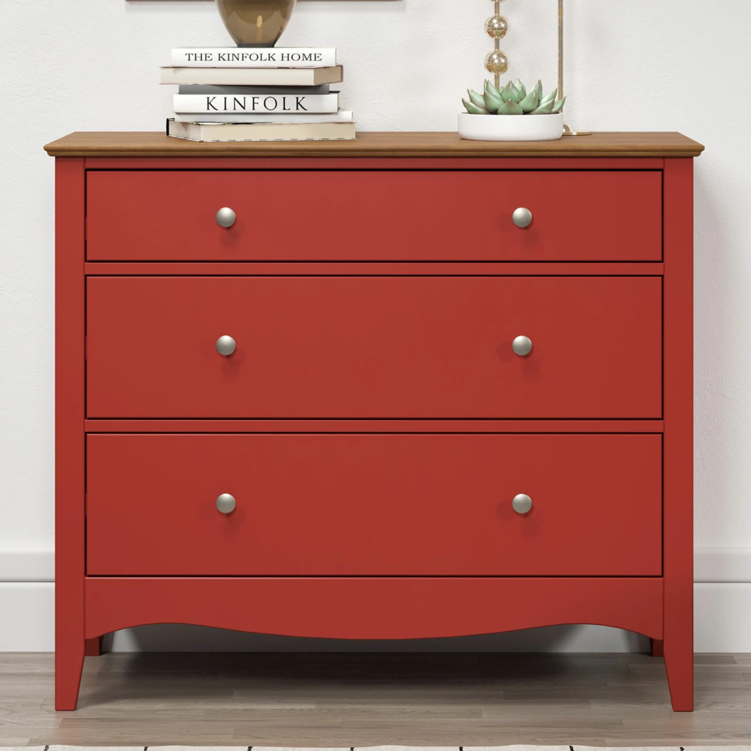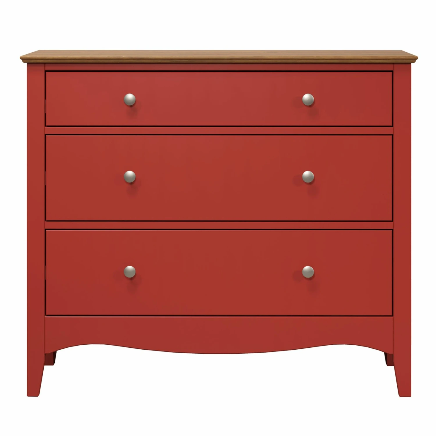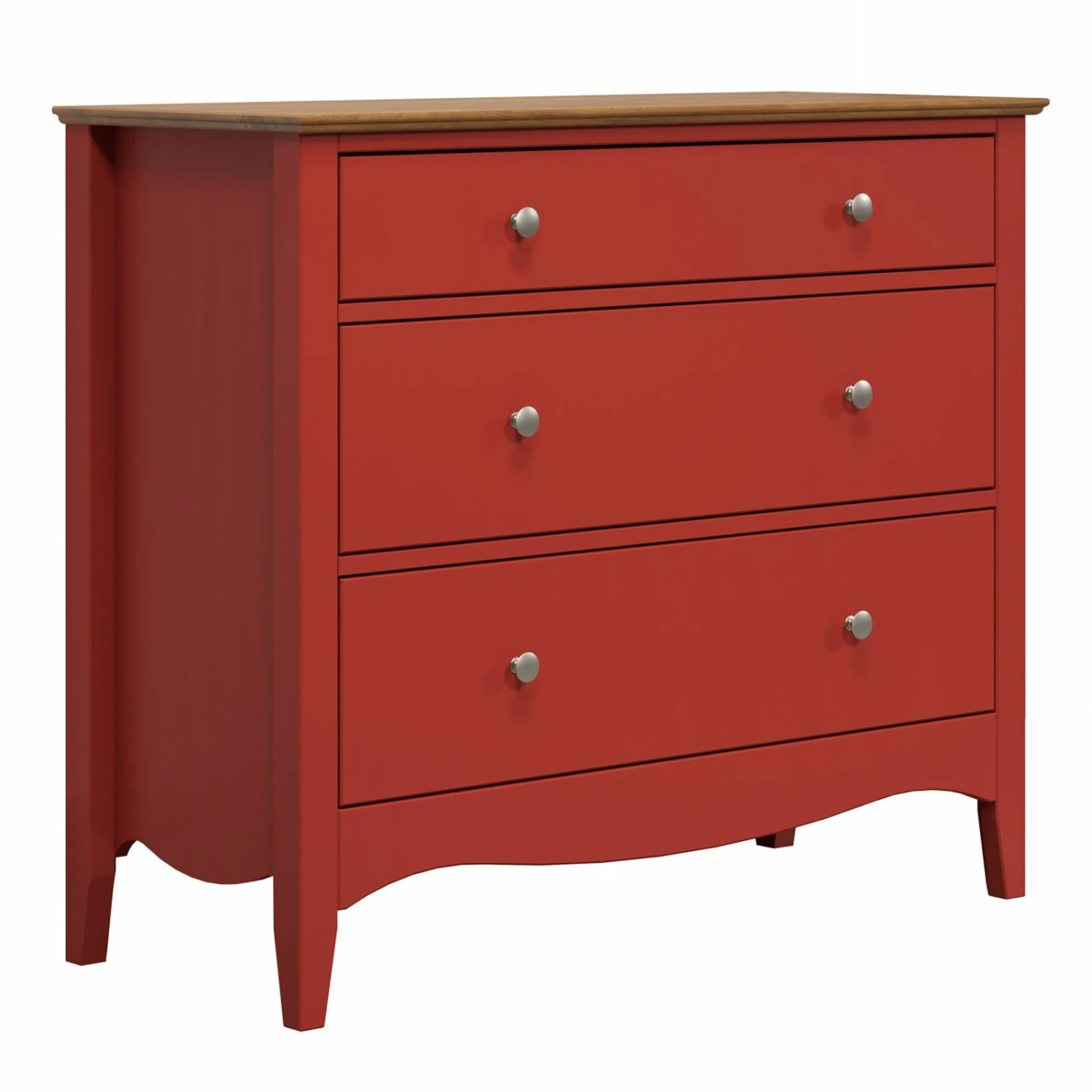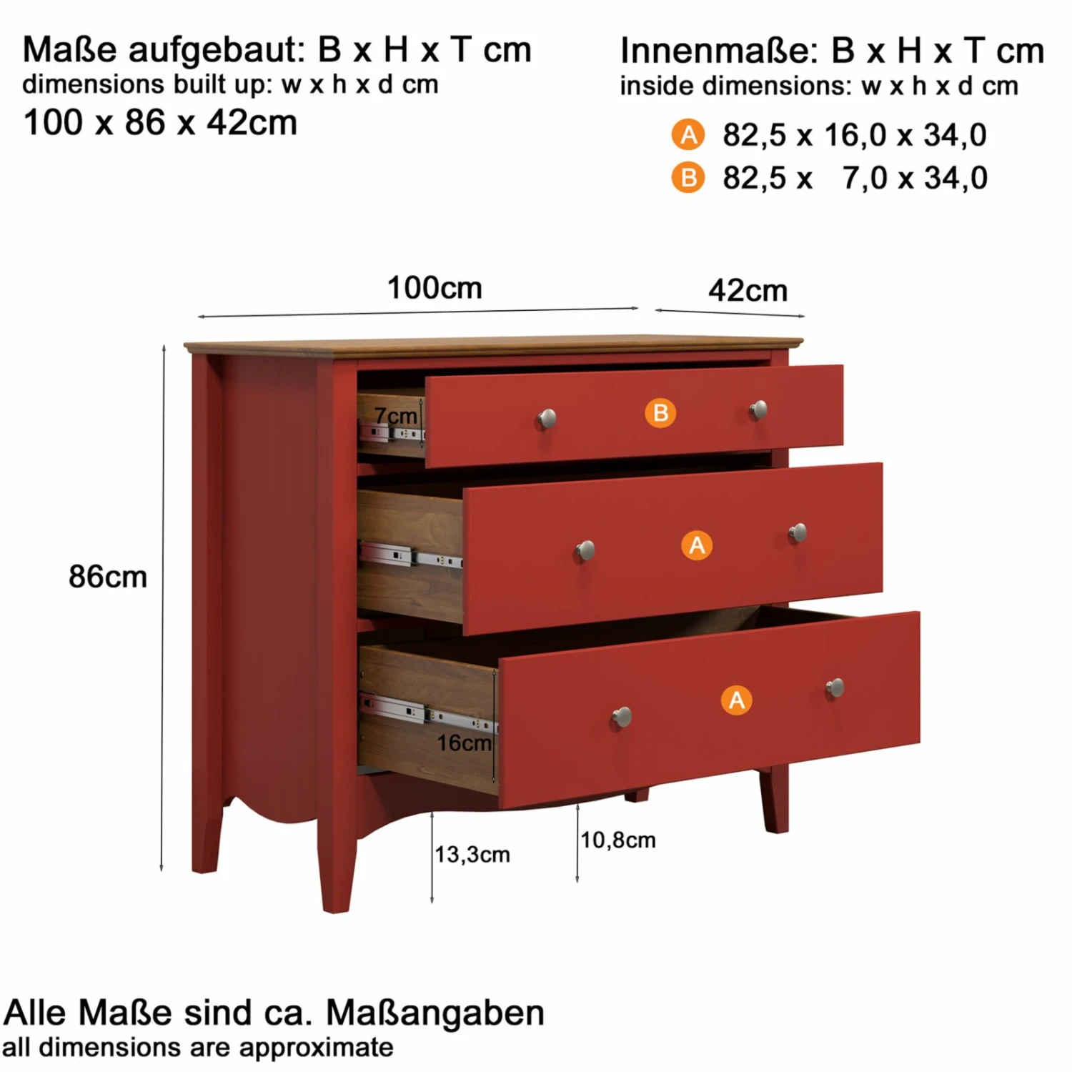 Die rot-braune Kommode liefert eine wunderschöne Optik aufgrund der harmonischen Farbkombination. Darüber hinaus bietet Sie eine hochwertige Qualität, denn Sie ist aus teilmassiven Kieferholz. Obendrein sind die Schubkästen mit Metallknöpfen versehen, welche die Optik bestärken.