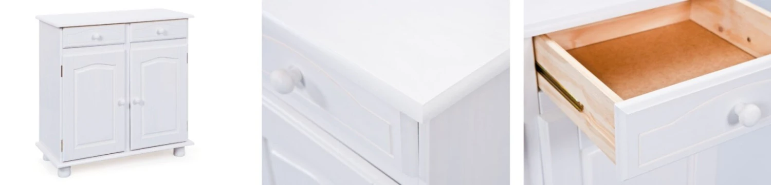 Die Kommode LOVI präsentiert sich in einem romantischen Landhausstil und wurde aus robustem und langlebigem Massivholz gefertigt. Hinter zwei Türen und in zwei Schubkästen kann diese Massivholzkommode mit viel Stauraum überzeugen. Die Oberfläche ist in Weiß lackiert und dabei wurde der Lack so aufgetragen, dass die individuellen Maserungen des Massivholzes sichtbar bleiben. Dadurch ist gewährleistet, dass der natürliche Holzcharakter der Weihrauchkiefer erhalten bleibt. Der verwendete Lack ist schadstoffarm, pflegeleicht und wasserabweisend.