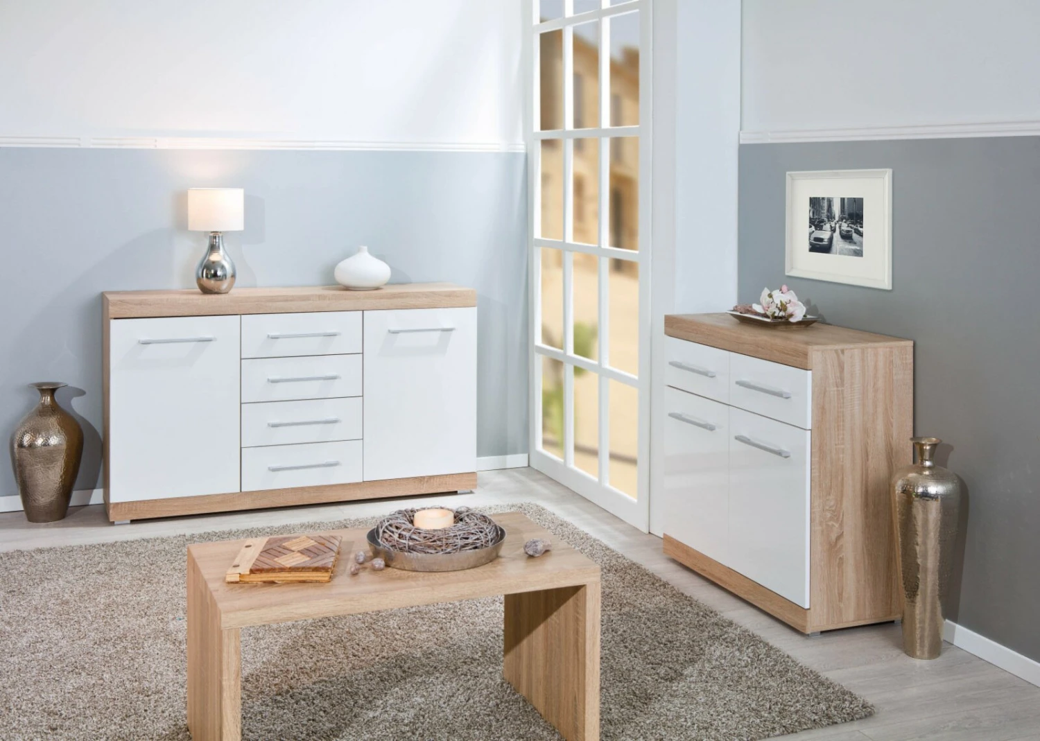Die moderne Kommode ist mit einer Melaminbeschichtung versehen, welches die Kommode kratzfest und strapazierfähig macht. Darüber hinaus sieht die Kommode mit Ihren weißen Hochglanzfronten und der Farbkombination sehr edel aus und verleiht Ihnen Zuhause eine wolhfühlende Atmosphäre. Über Stauraummöglichkeiten brauchen Sie sich bei der Kommode keine Sorgen machen, denn die Kommode verfügt über vier Schubladen und zwei weiteren Stauraummöglichkeiten, wo sie bei Bedarf Einlegeböden einsetzen können. Die zwei weiteren Stauraummöglichkeiten sind in dem Fall mit den zwei Drehtüren versehen.