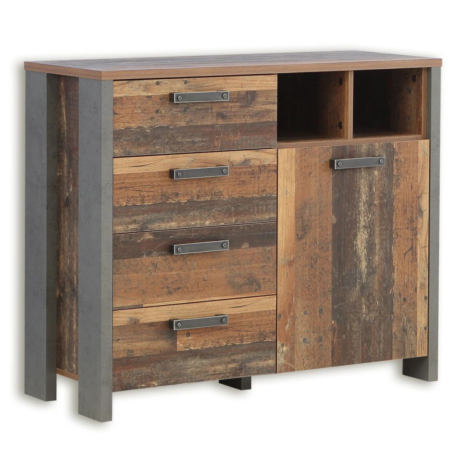 Der rustikale Look von dieser Kommode wird in Ihren Räumlichkeiten ein warmes und wohnliches Ambiente versprühen! Die Kombination aus Holz- und Beton-Optik verleiht diesem Möbelstück ein raffiniertes Äußeres. Hinter einer Tür, in vier Schubkästen und in zwei offenen Fächern bietet diese Kommode reichlich Platz zum Verstauen verschiedenster Untensilien.