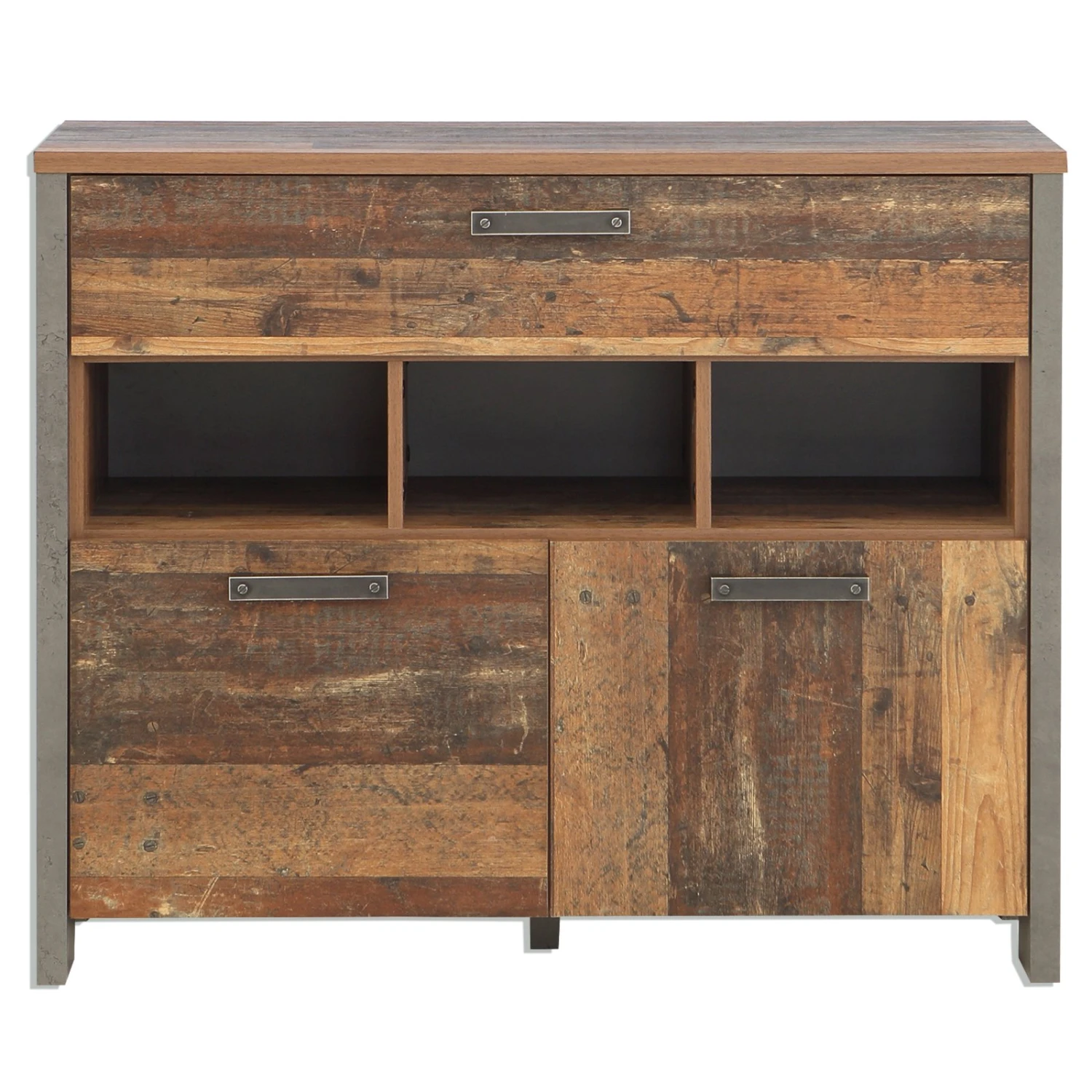 Der rustikale Look von dieser Kommode wird in Ihren Räumlichkeiten ein warmes und wohnliches Ambiente versprühen! Die Kombination aus Holz- und Beton-Optik verleiht diesem Möbelstück ein raffiniertes Äußeres. Hinter zwei Türen, in einem Schubkasten und in drei offenen Fächern bietet diese Kommode reichlich Platz zum Verstauen verschiedenster Untensilien.