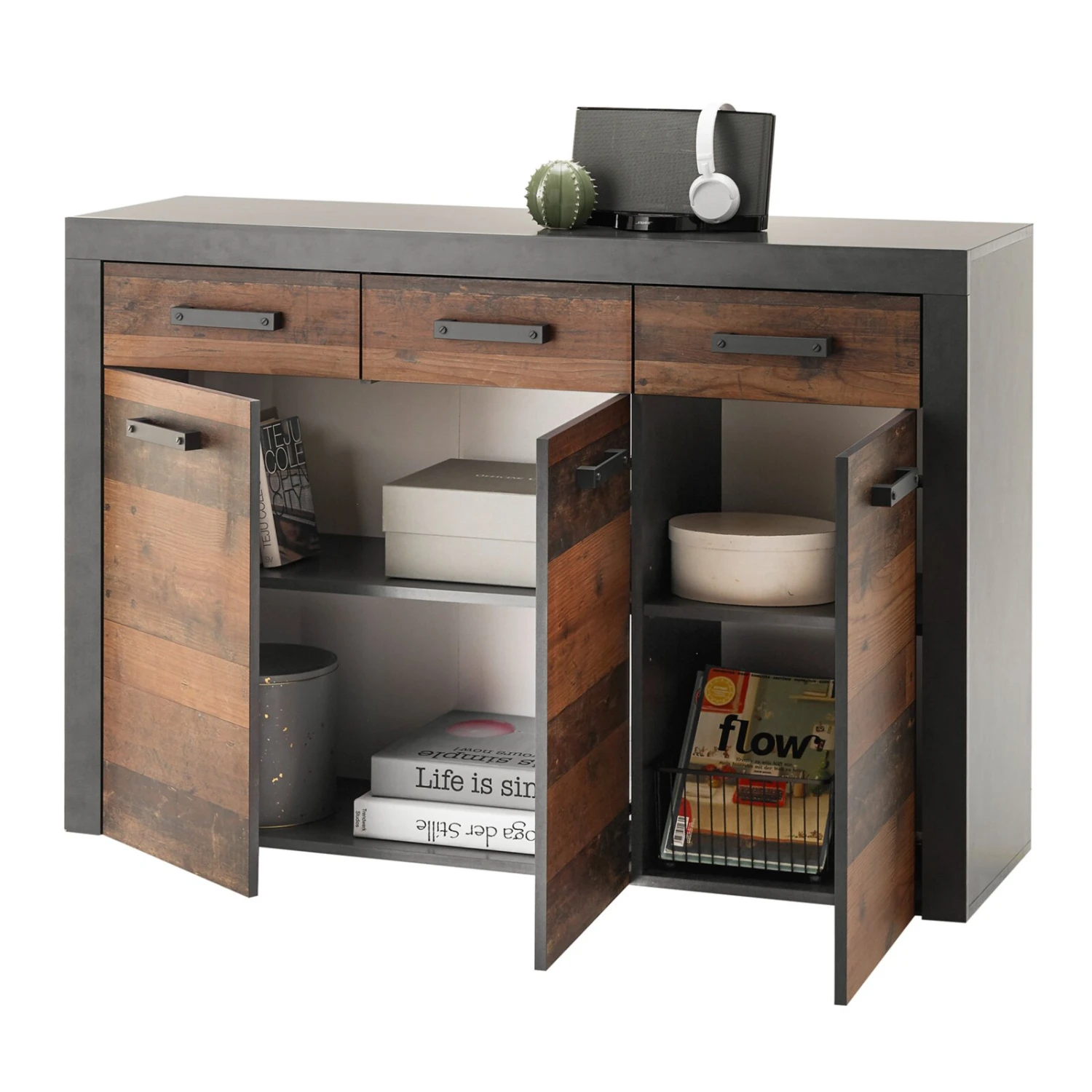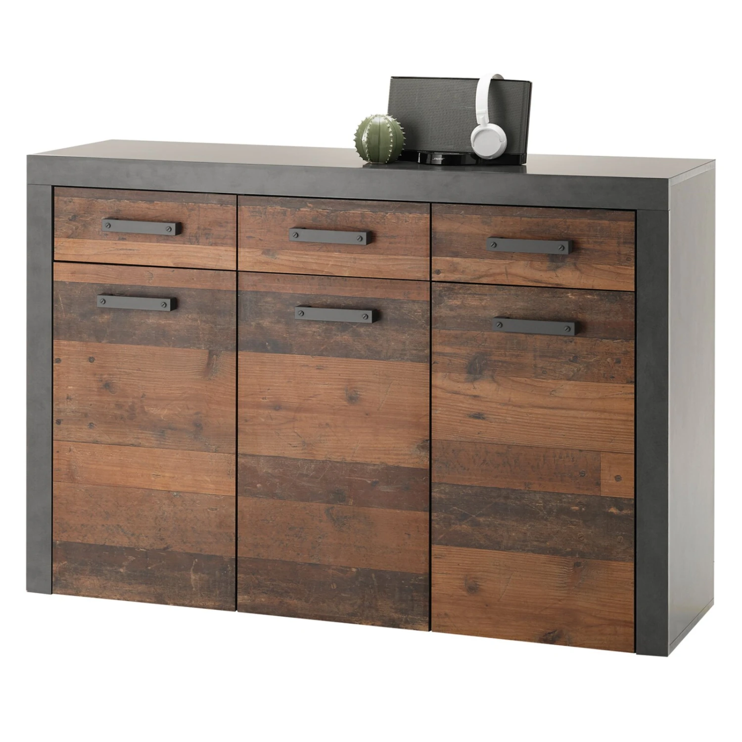 Im industriellen Stil präsentiert sich diese etwa 135 Zentimeter breite Kommode. Der Mix aus Old Wood Vintage und Matera Nachbildung lässt das geräumige Möbelstück zum echten Hingucker werden. Hinter drei Türen und in drei Schubkasten findest du viel Platz für deine Utensilien.