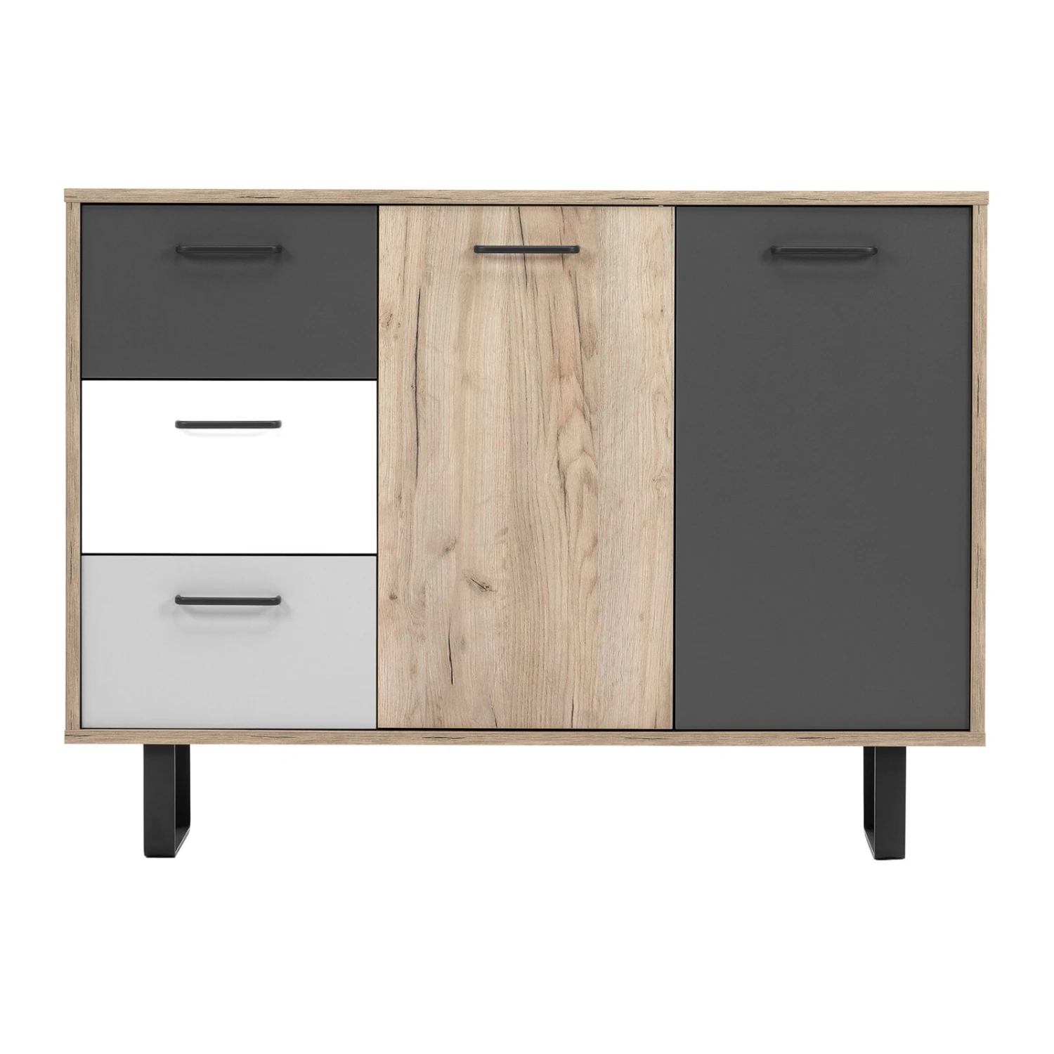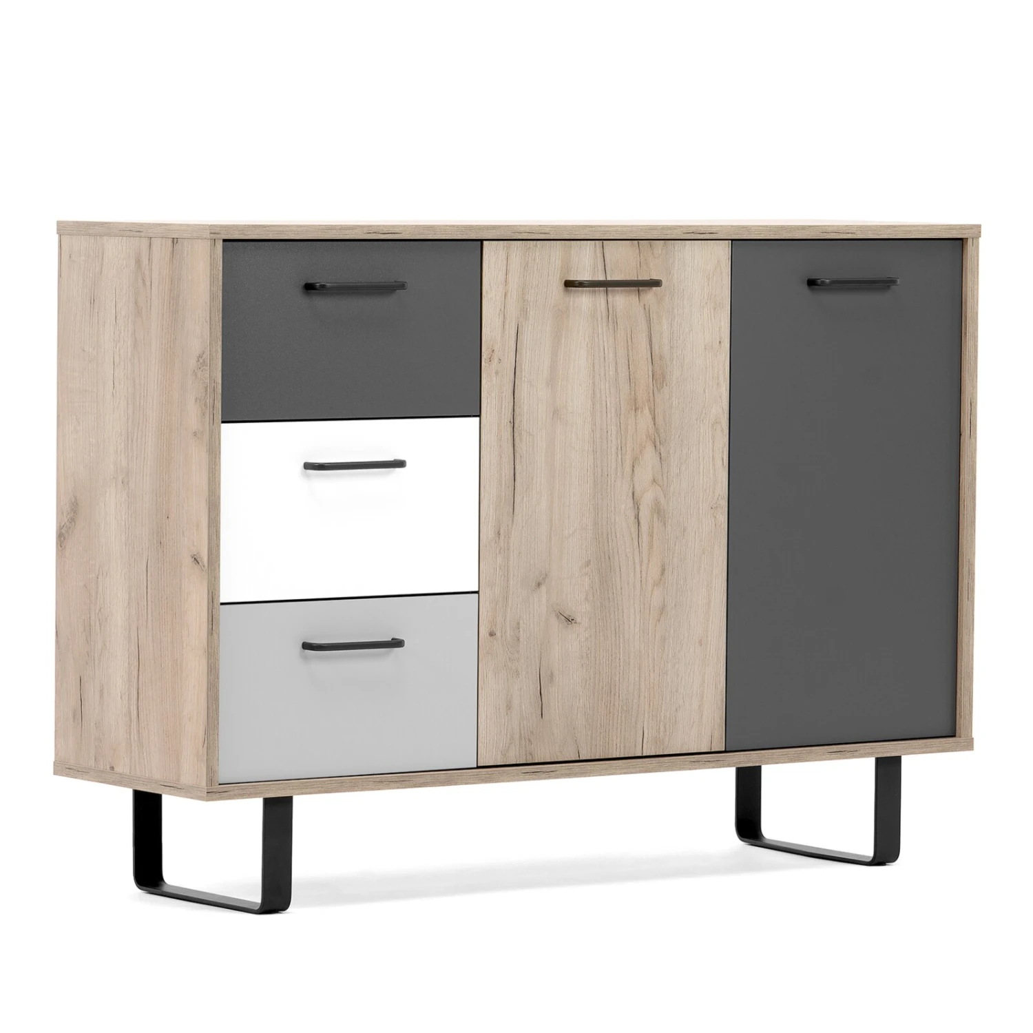 Die Kommode ORLANDO ist durch seine drei Schubkästen und zwei Drehtüren ein echter Problemlöser, da sie ausreichend Stauraum bietet. Zudem ist die Kommode ein auffälliger Hingucker. Der Korpus ist in Grey Craft Oak Nachbildung gehalten und die Schubladen- und Türfronten weisen unterschiedliche Farbtöne auf.