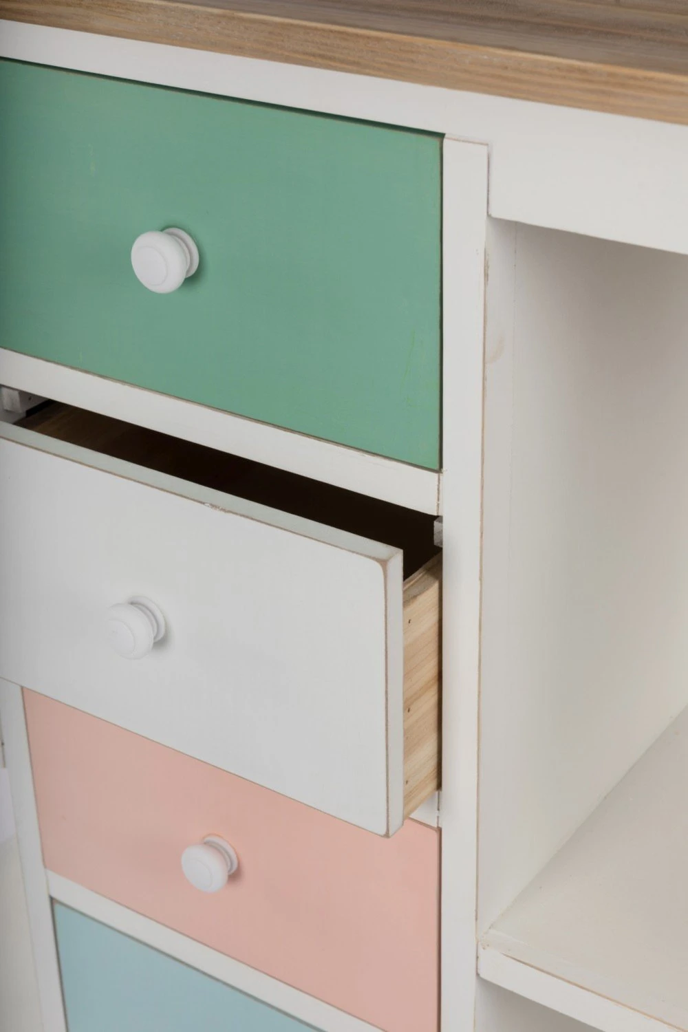 Die Kommode RAINBOW ist ein besonderes Highlight. Sie ist offen gestaltet und bietet eine Menge Ablageflächen an den Seiten sowie auf der naturfarbenen Abdeckplatte. Mittig befinden sich fünf Schubkästen, die sich in verschiedenen Farben präsentieren: Grün, Weiß, Orange, Blau und Violett. Ein absoluter Eyecatcher mit einer Menge Stauraum.
